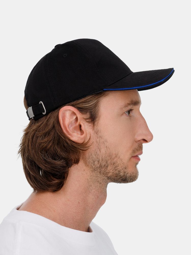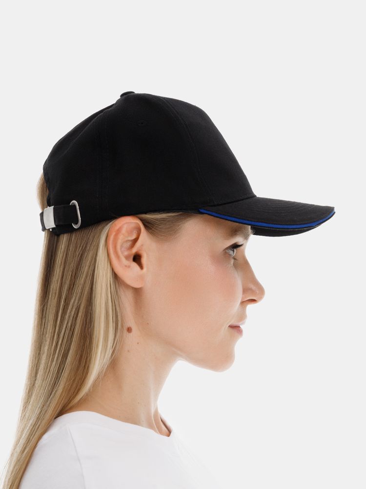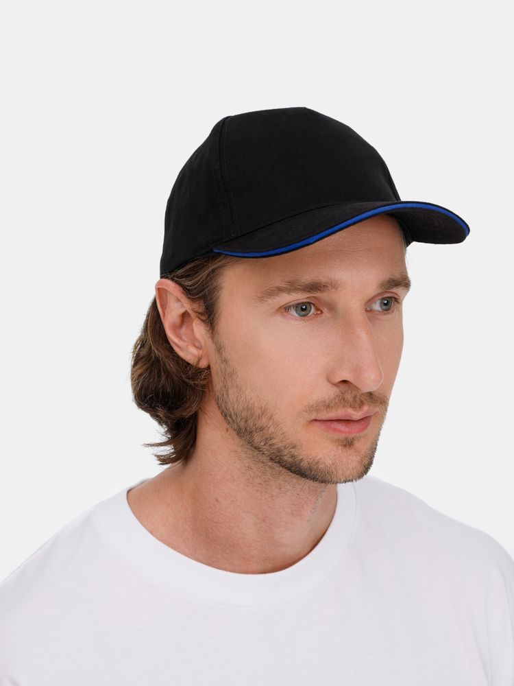 Модель бейсболки с 5-ю клиньями без лобового шва из плотного чесаного хлопка.