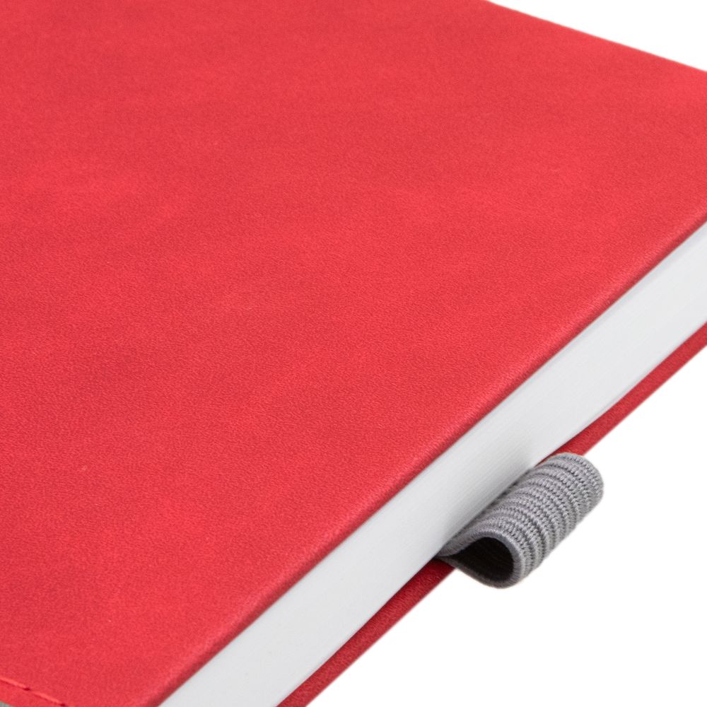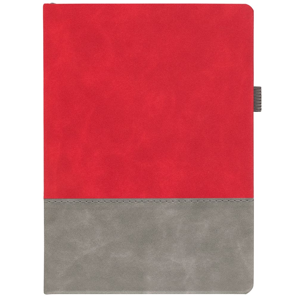 Ежедневник с твердой обложкой, без поролона, со сшивкой материалов Nubuck Touch, серый СС, и Nubuck Touch красный РР, дополнен двойным ляссе и петлей-резинкой для ручки.