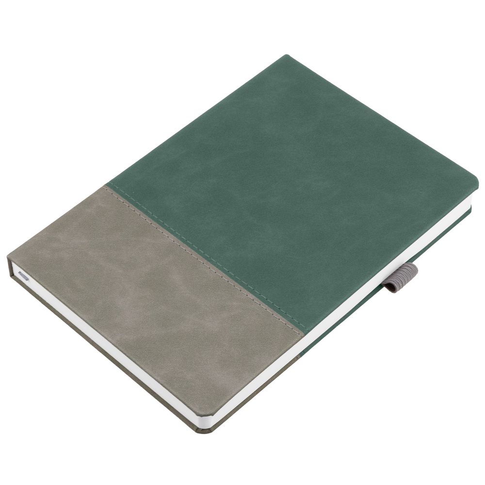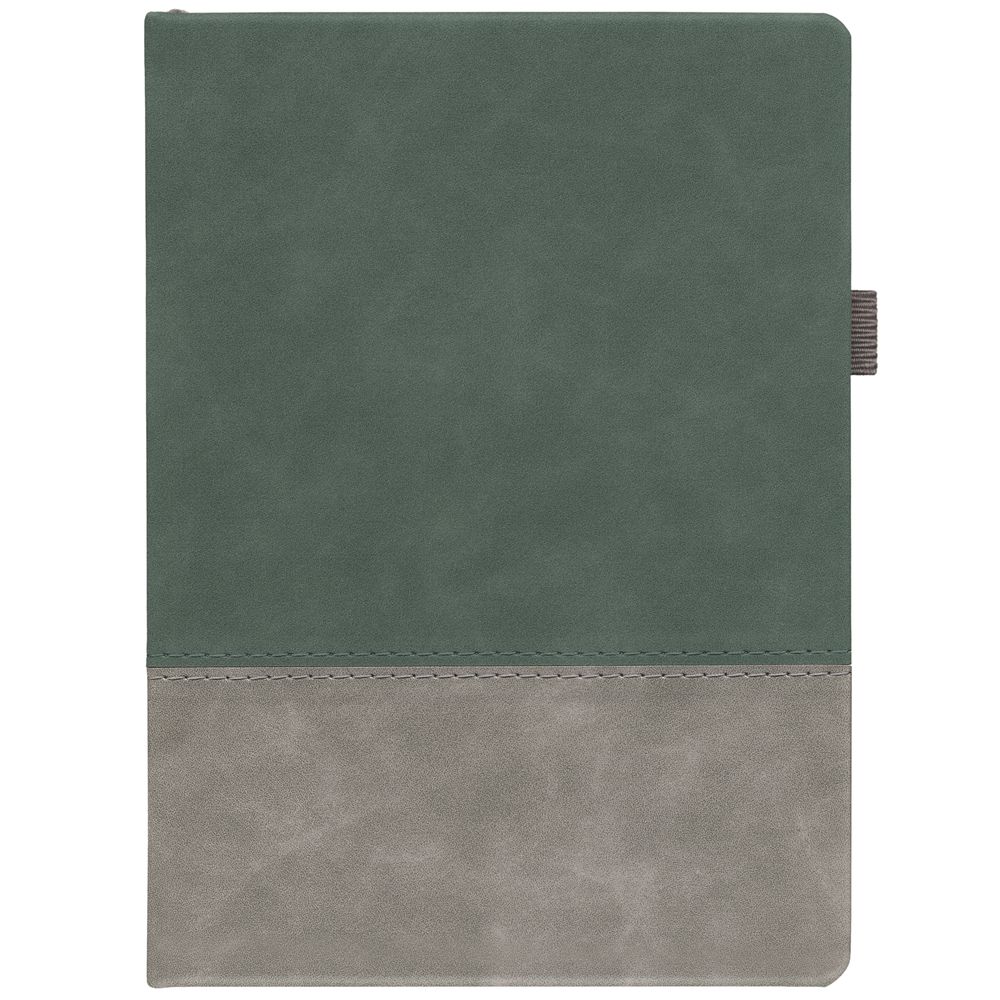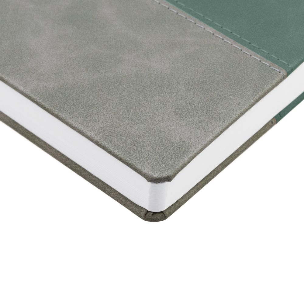 Ежедневник с твердой обложкой, без поролона, со сшивкой материалов Nubuck Touch, серый СС, и Nubuck Touch зеленый FF, дополнен двойным ляссе и петлей-резинкой для ручки.