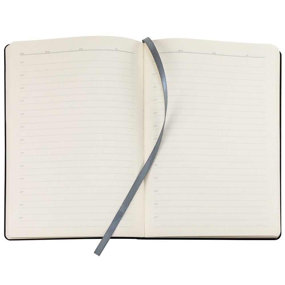 Ежедневник с гибкой обложкой, выполнен из материала Nubuck, темно-серый ЕЕ, дополнен петлей-лейблом для ручки и ляссе в цвет материала.