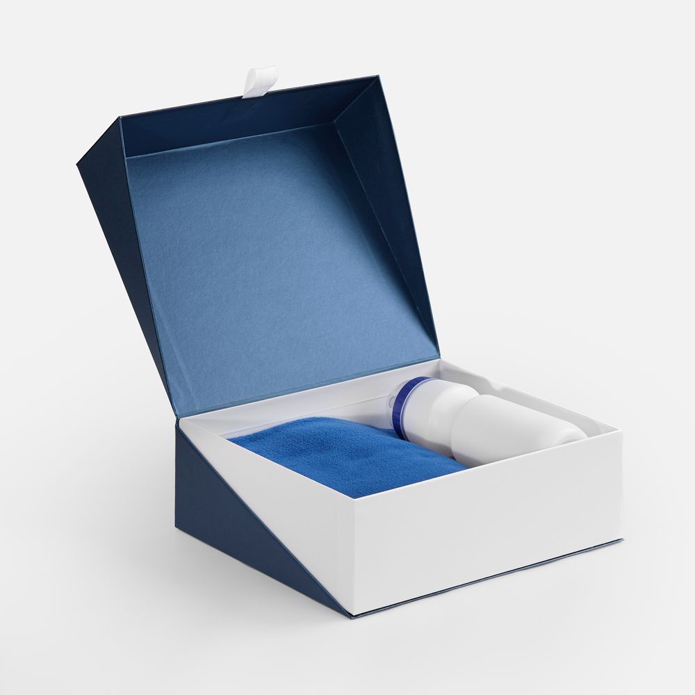 Коробка изготовлена из переплетного картона. Внутренний короб каширован мелованной бумагой с ламинацией, внешний корпус — лайнером из металлизированной бумаги Pearl Dream Blue, плотностью 135 г/м². Крышка фиксируется на магнит. -