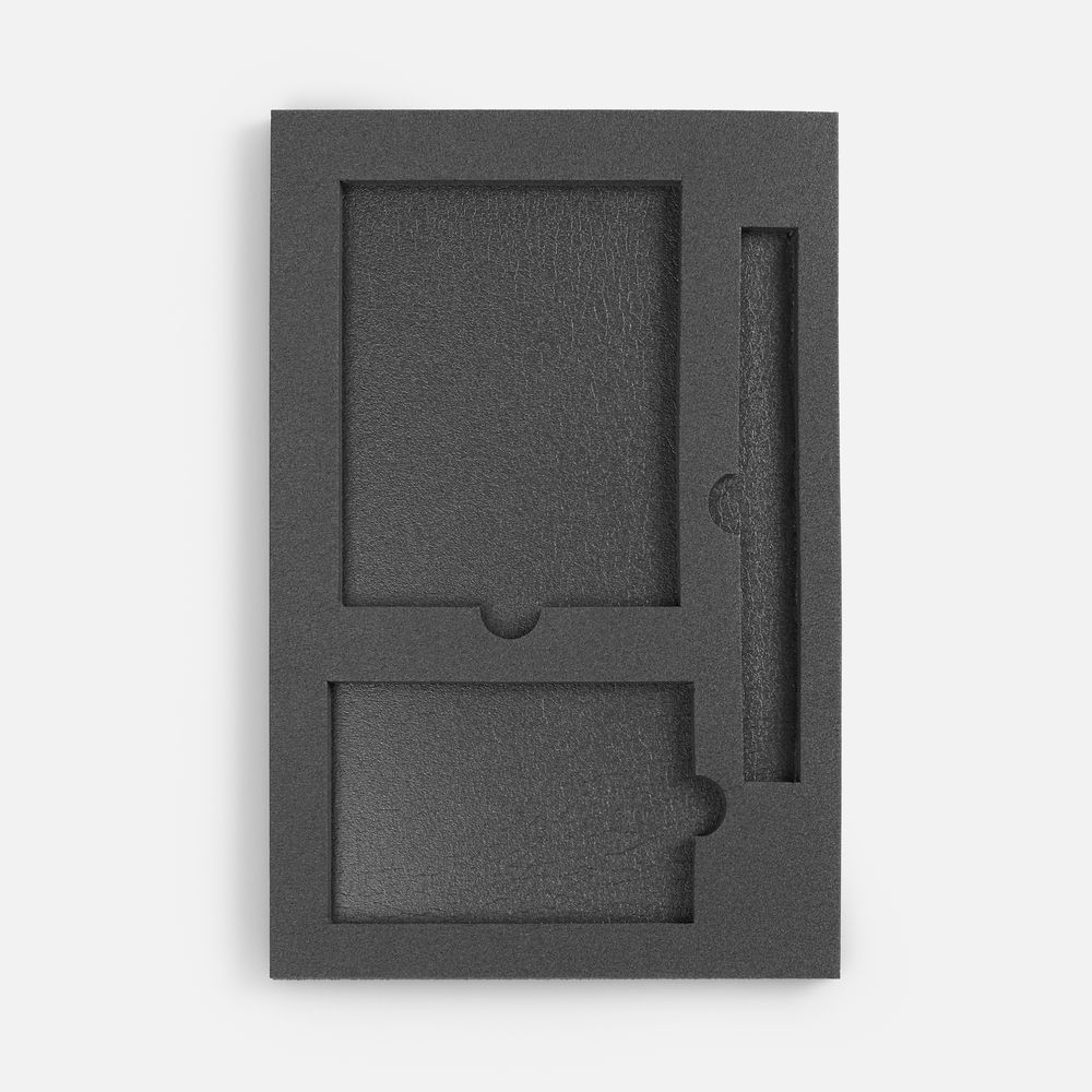 Ложемент, изготовленный из материала Izolon 500 черного цвета, представляет собой многослойную конструкцию, состоящую из нижнего слоя толщиной 5 мм и верхнего слоя толщиной 10 мм. В соответствии с утвержденным макетом, проемы для размещения предметов могут быть спроектированы как в одном, так и в обоих слоях.