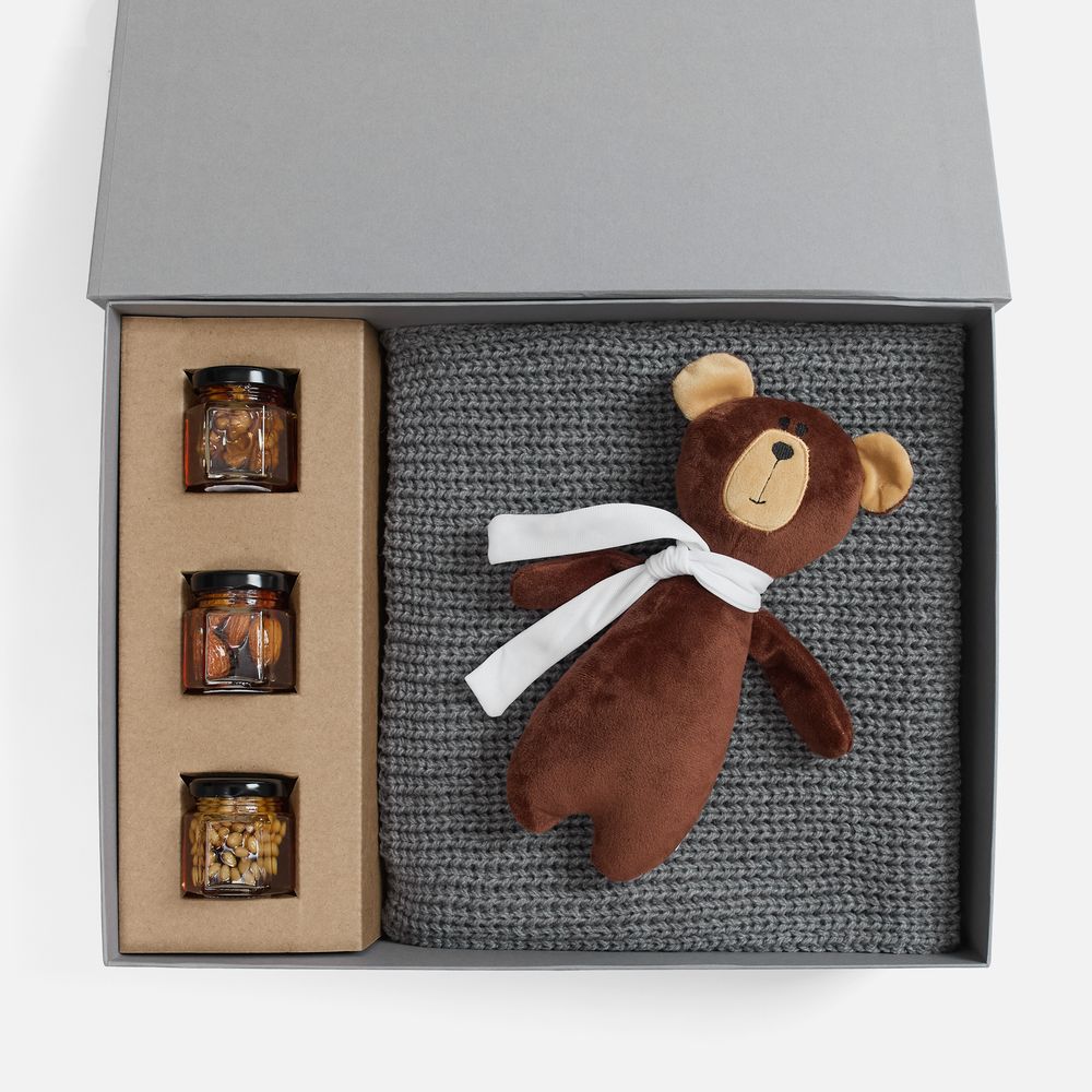 Милый мишка в шарфике с целой коллекцией разнообразного ароматного меда идеально дополняет основной, более практичный подарок — объемный шарф из толстой пряжи, который впишется в любой зимний образ. -