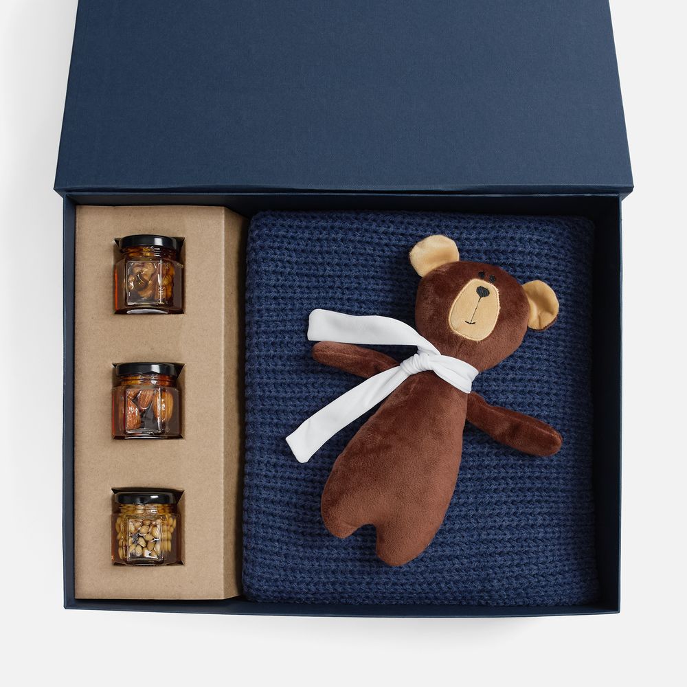 Милый мишка в шарфике с целой коллекцией разнообразного ароматного меда идеально дополняет основной, более практичный подарок — объемный шарф из толстой пряжи, который впишется в любой зимний образ. -