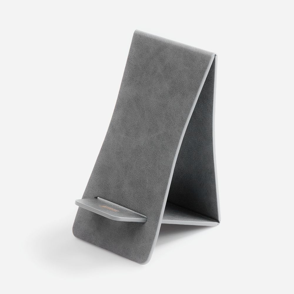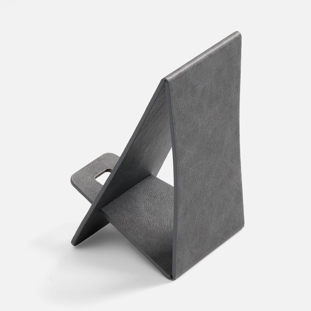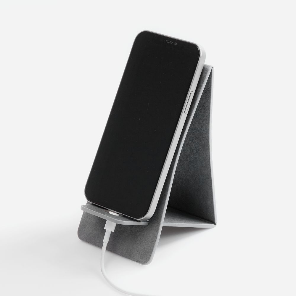 Складная подставка для телефона с вырубкой под шнур зарядного устройства. Выполнена из материала Petrus.