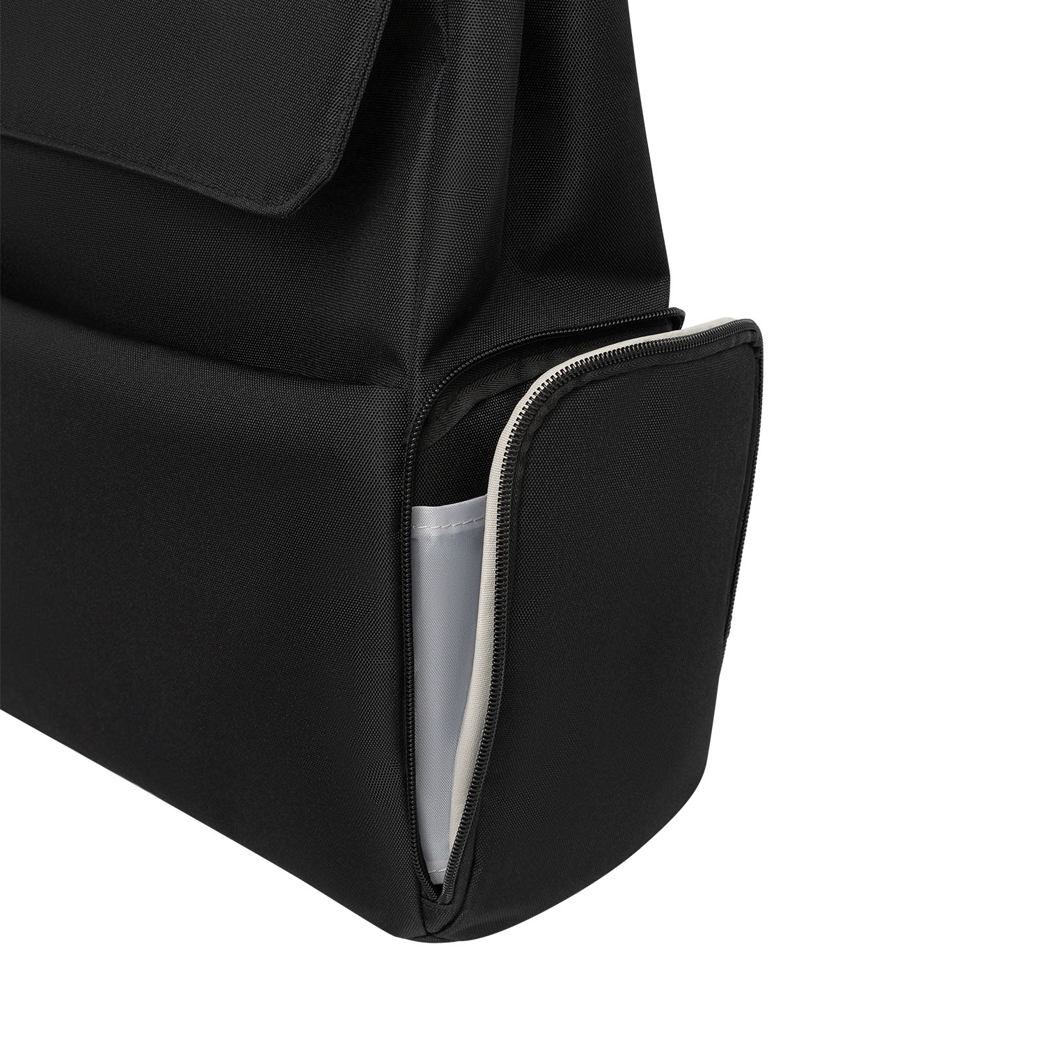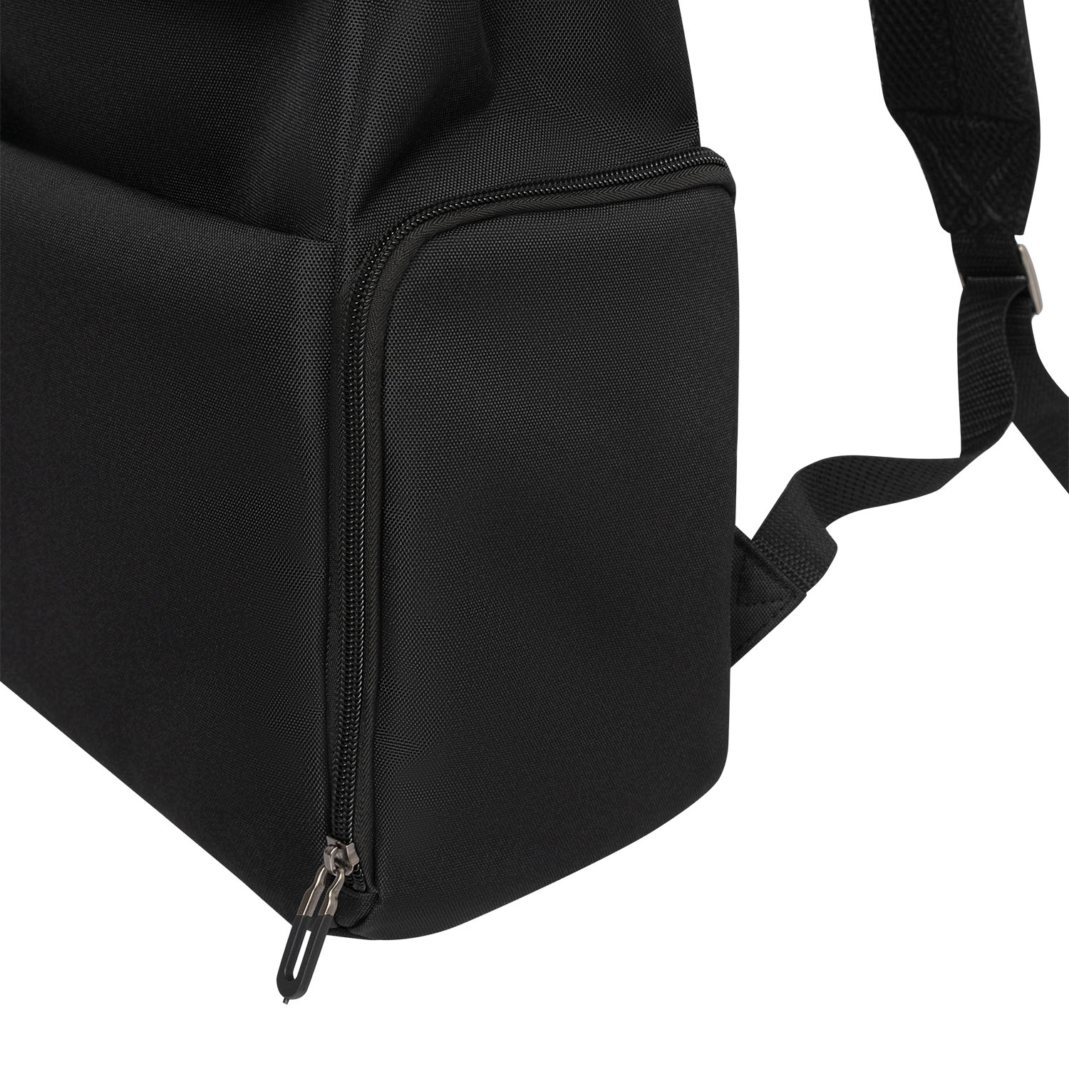 Основное отделение вмещает ноутбук до 15,6 дюймов в уплотненном кармане с фиксирующим ремнем на липучке. Внутри основного отделения есть карман для фиксации пластиковой бутылки или небольшого термоса. Боковые карманы разного типа — один объемный на молнии, второй плоский — позволяют удобно разместить все необходимые вещи.