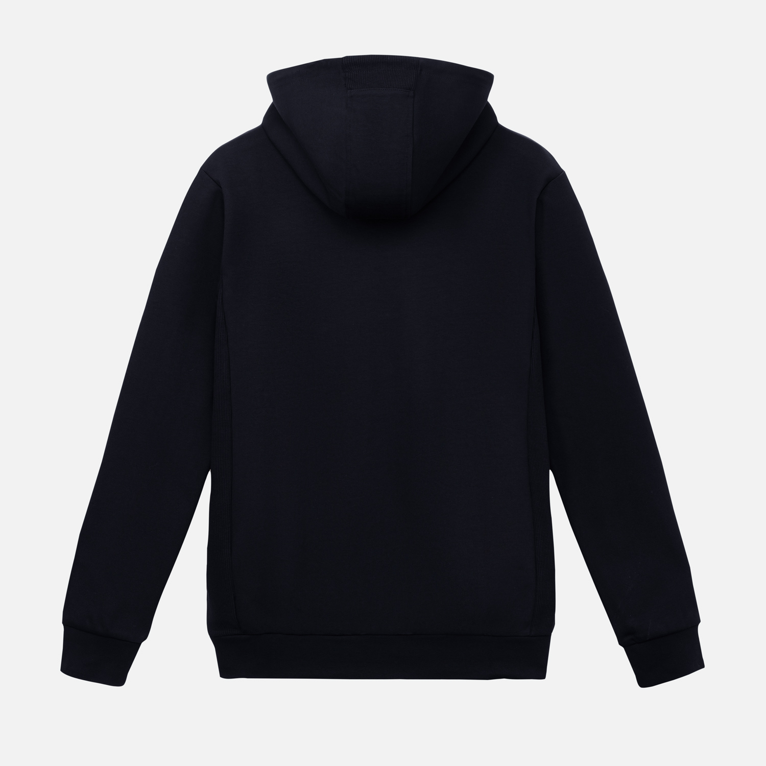 Толстовка сделана из мягкой и прочной ткани интерлок "doubleface", которая приятна к телу и легка в уходе, не растягивается, не выцветает и не деформируется после стирки. Манжеты и низ сделаны из плотной резинки 2х2, благодаря чему вещь держит форму. Карманы на потайных молниях придают толстовке аккуратный вид. Капюшон на подкладке из ткани джерси в тон регулируется шнурками.