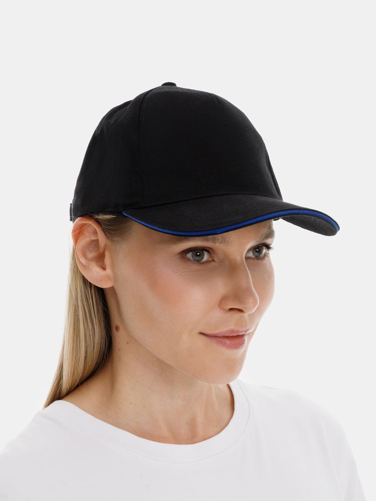 Модель бейсболки с 5-ю клиньями без лобового шва из плотного чесаного хлопка.