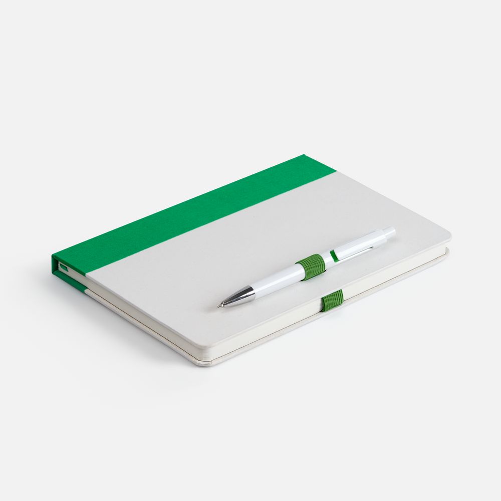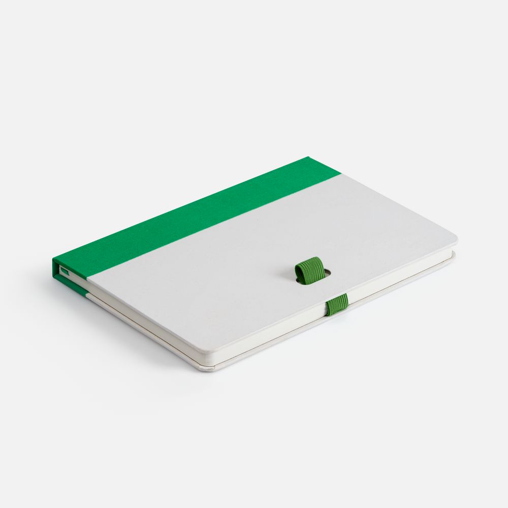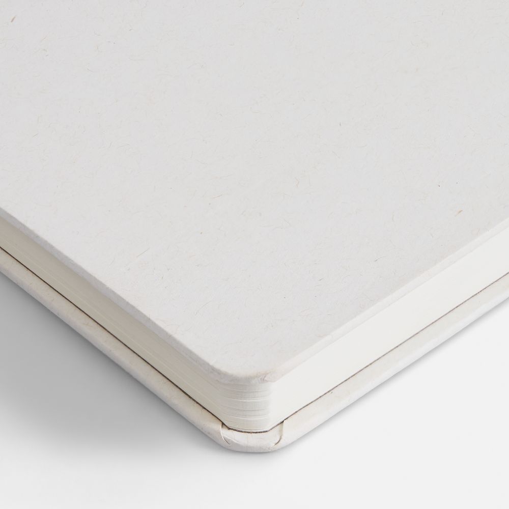 Бумага и обложка произведены из переработанных пакетов из под молока. Обложка из картона плотностью 140 г/м² .Блок в линейку: