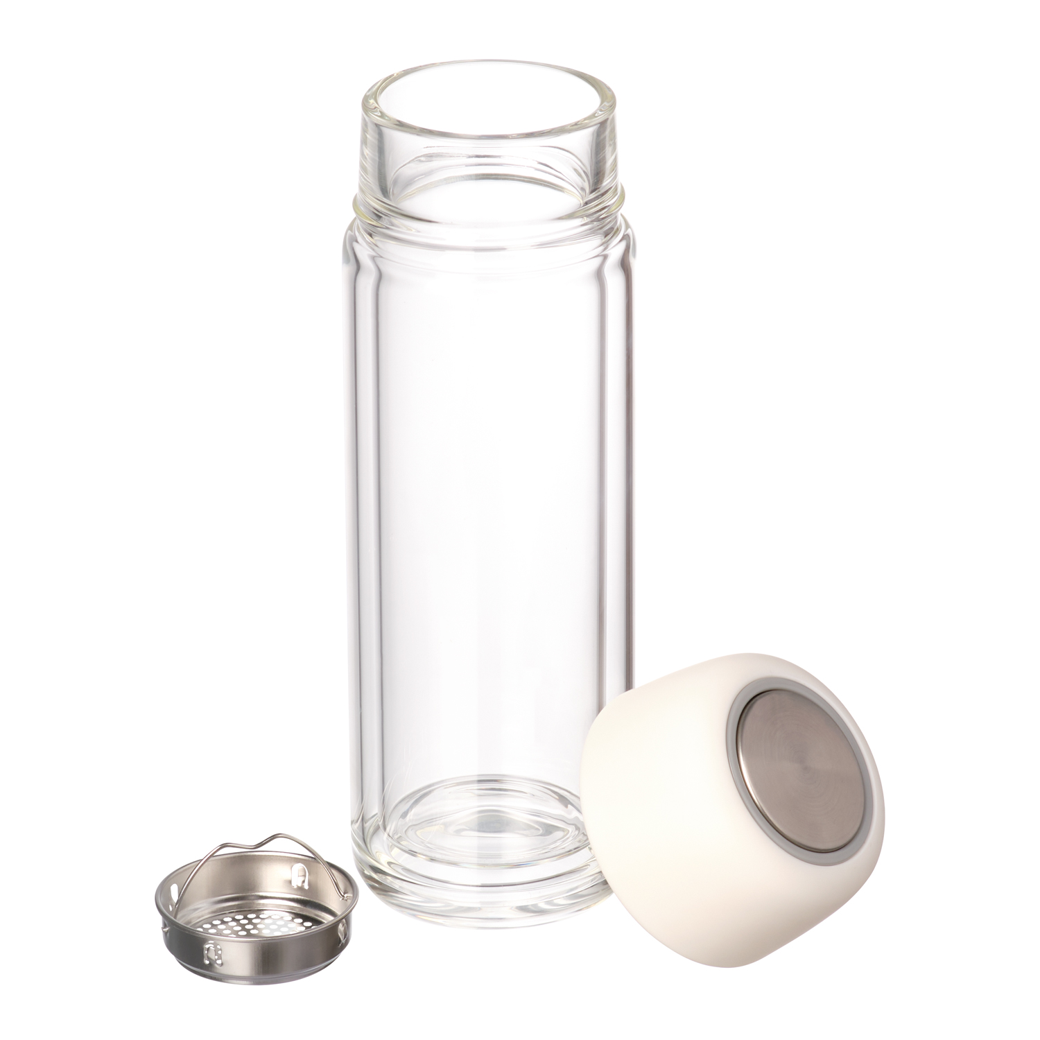 Стеклянная бутылка с двойными стенками позволит носить свежезаваренный чай с собой. Ситечко позволит заварить чай прямо в бутылке.