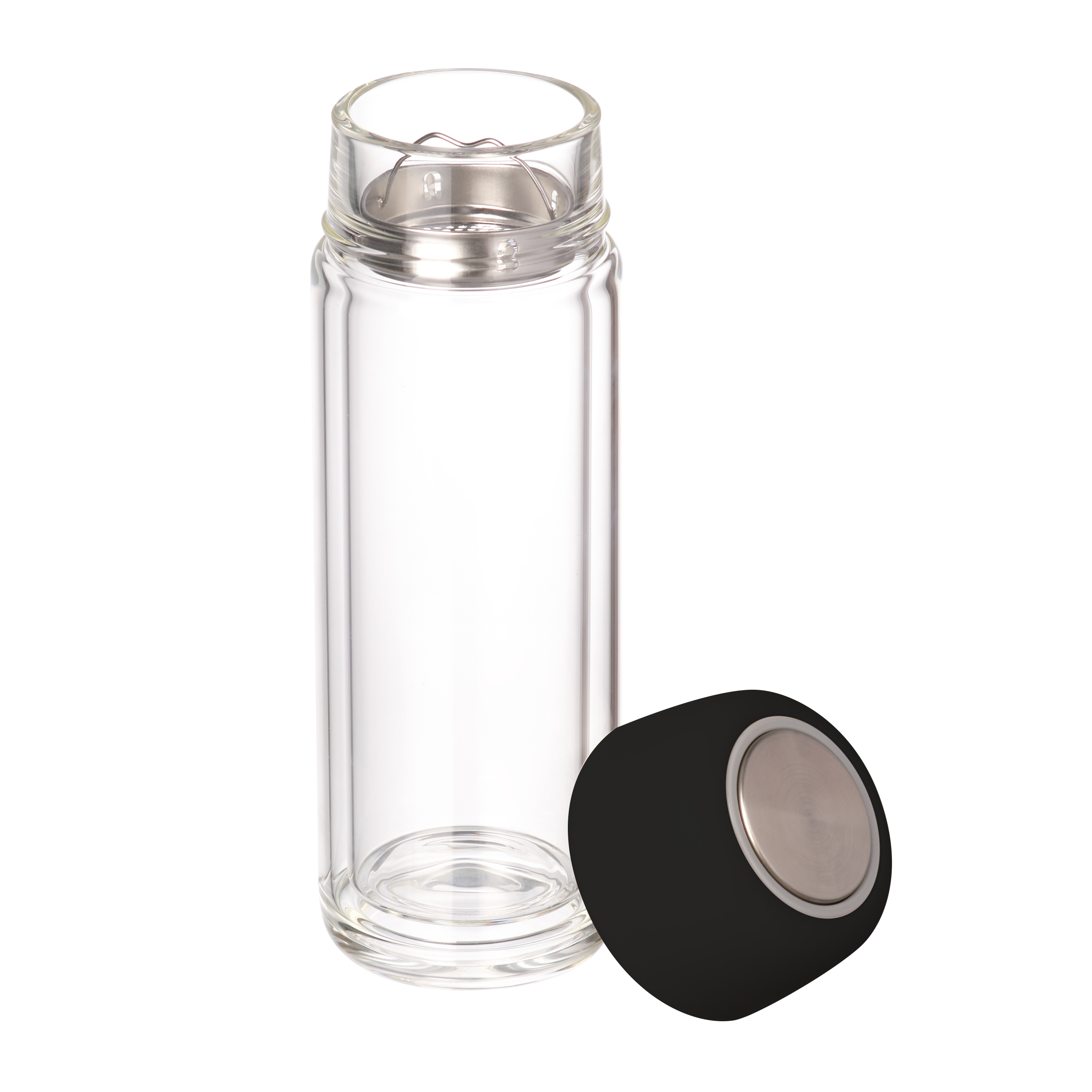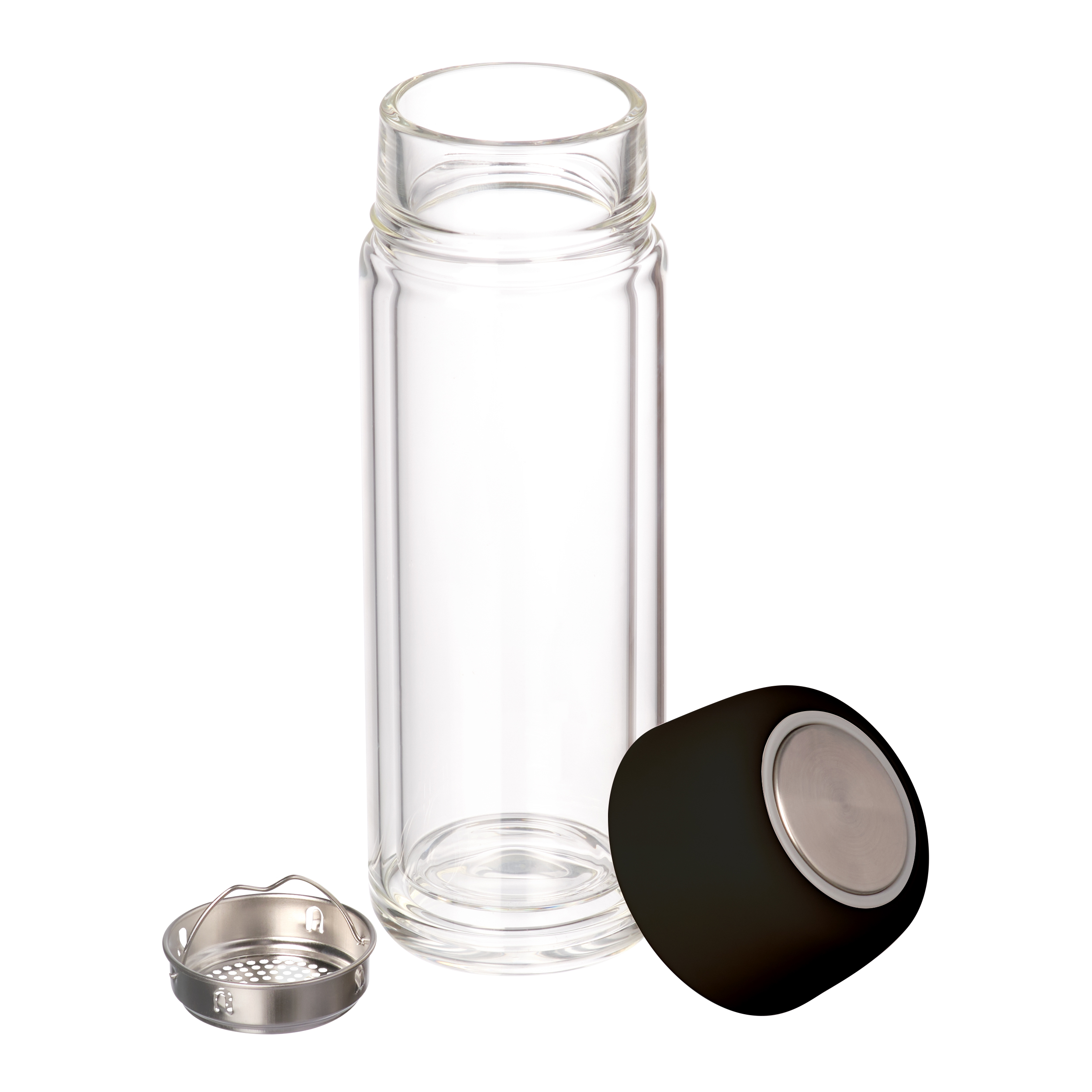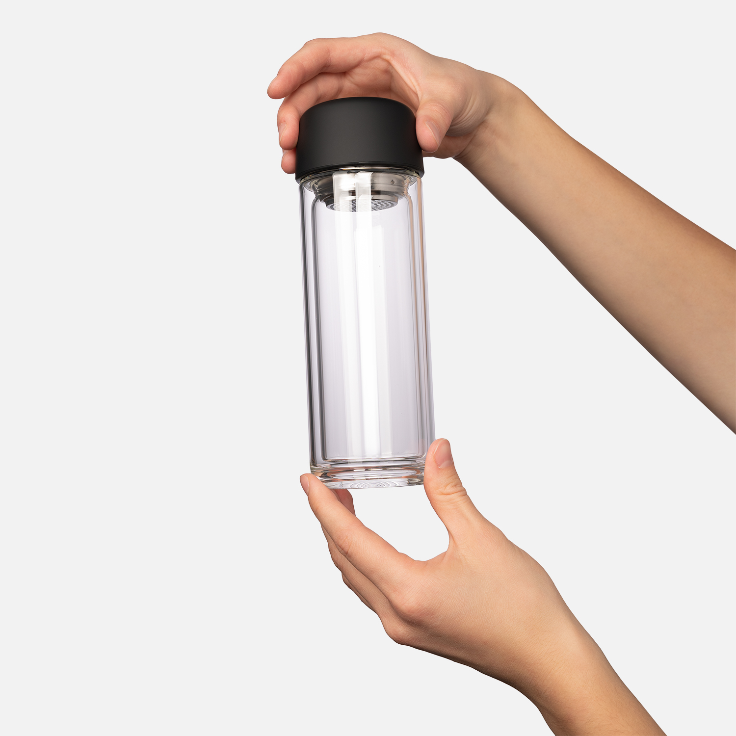 Стеклянная бутылка с двойными стенками позволит носить свежезаваренный чай с собой. Ситечко позволит заварить чай прямо в бутылке.
