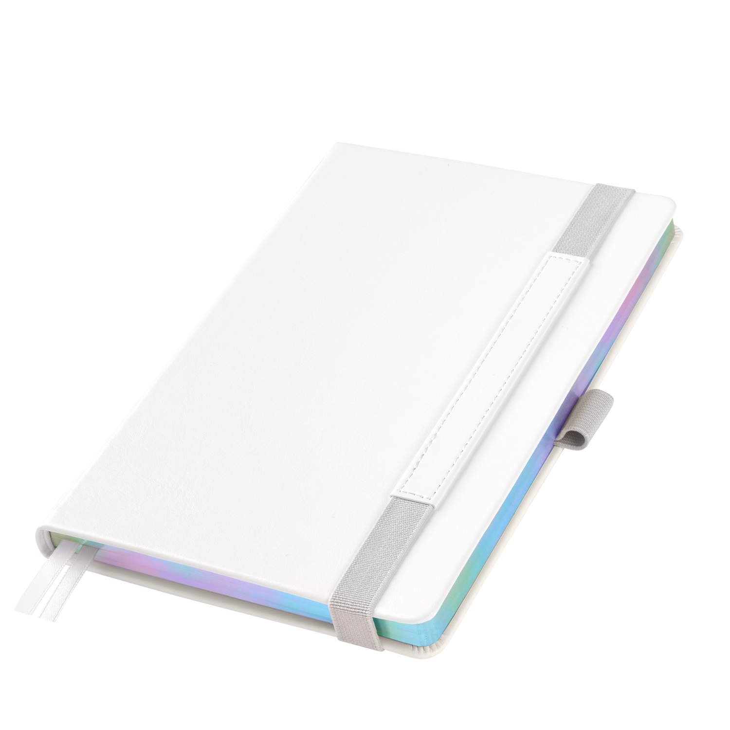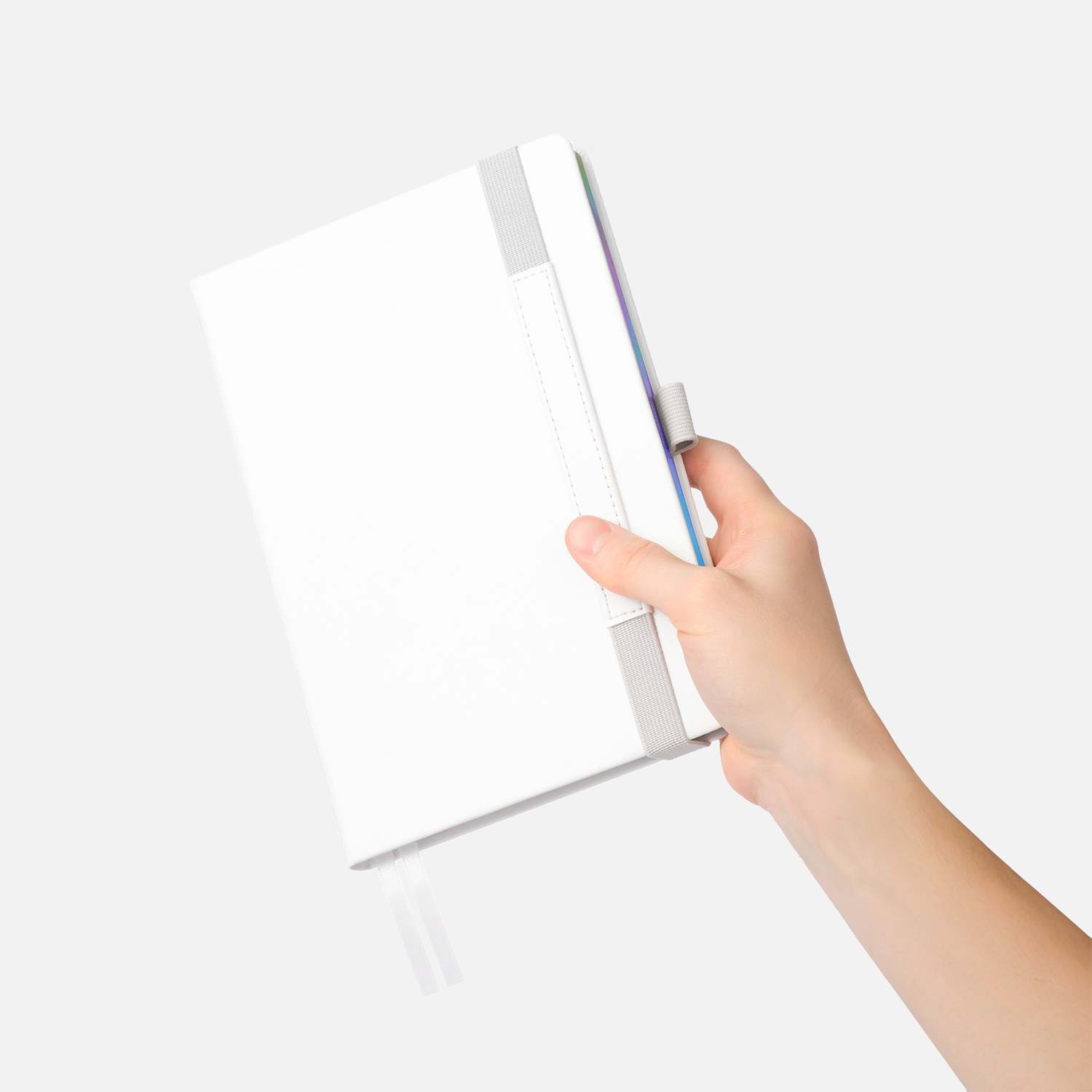Недатированный ежедневник в жесткой обложке из качественной искусственной кожи. Материал обложки гладкий, текстурированный, с полуглянцевым блеском. Скругленные углы обложки и внутреннего блока. Отличительная особенность коллекции — голографический фольгированный срез блока. Форзац/нахзац– серые. Вариант в жесткой обложке украшен широкой вертикальной резинкой-фиксатором с вставкой из ПУ-материала обложки и петелькой под ручку, а также двойным ляссе (серым и в тон обложки).