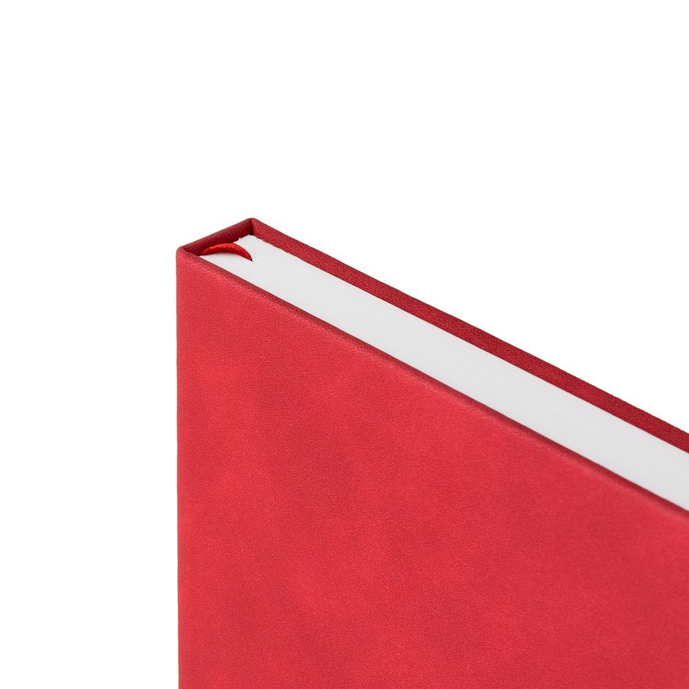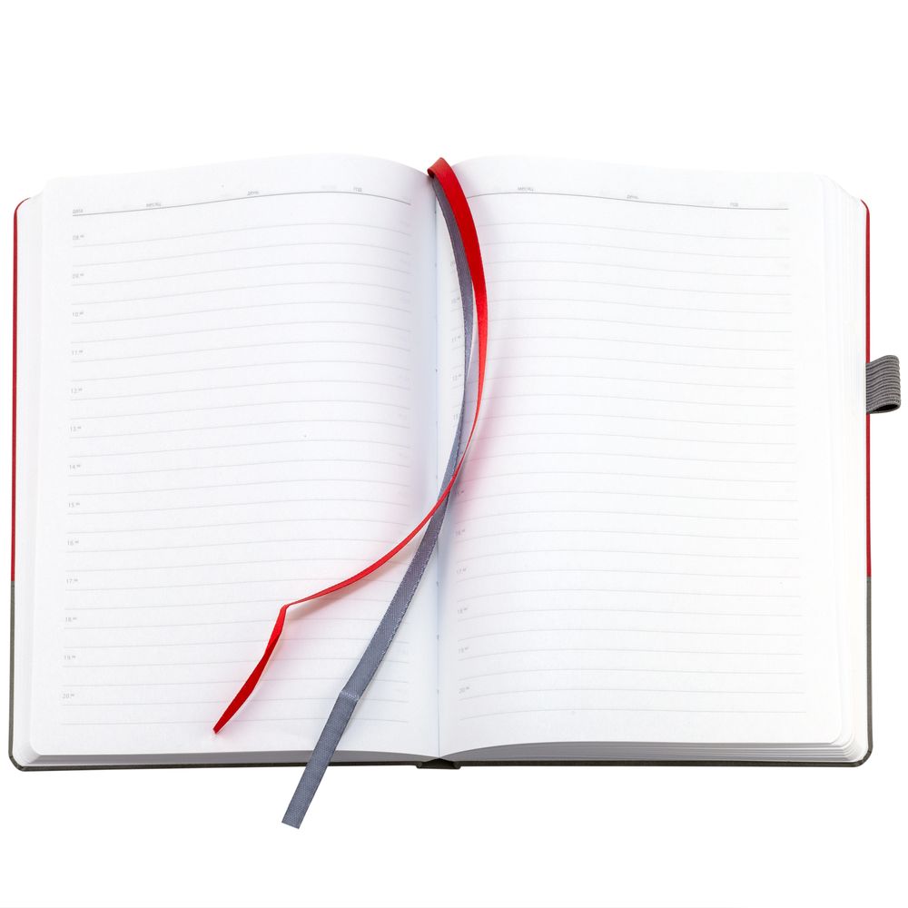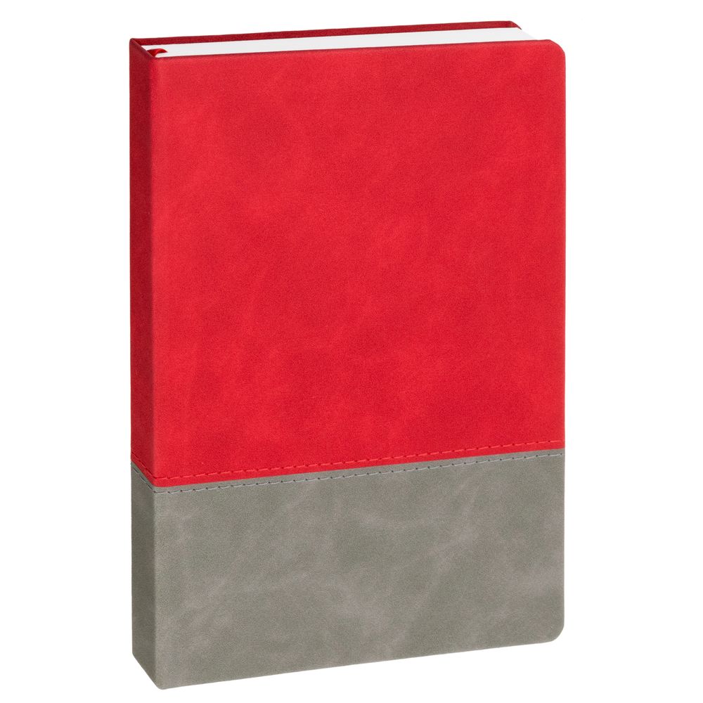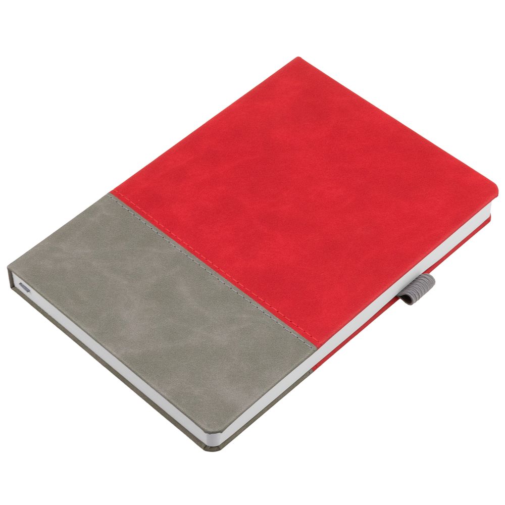Ежедневник с твердой обложкой, без поролона, со сшивкой материалов Nubuck Touch, серый СС, и Nubuck Touch красный РР, дополнен двойным ляссе и петлей-резинкой для ручки.