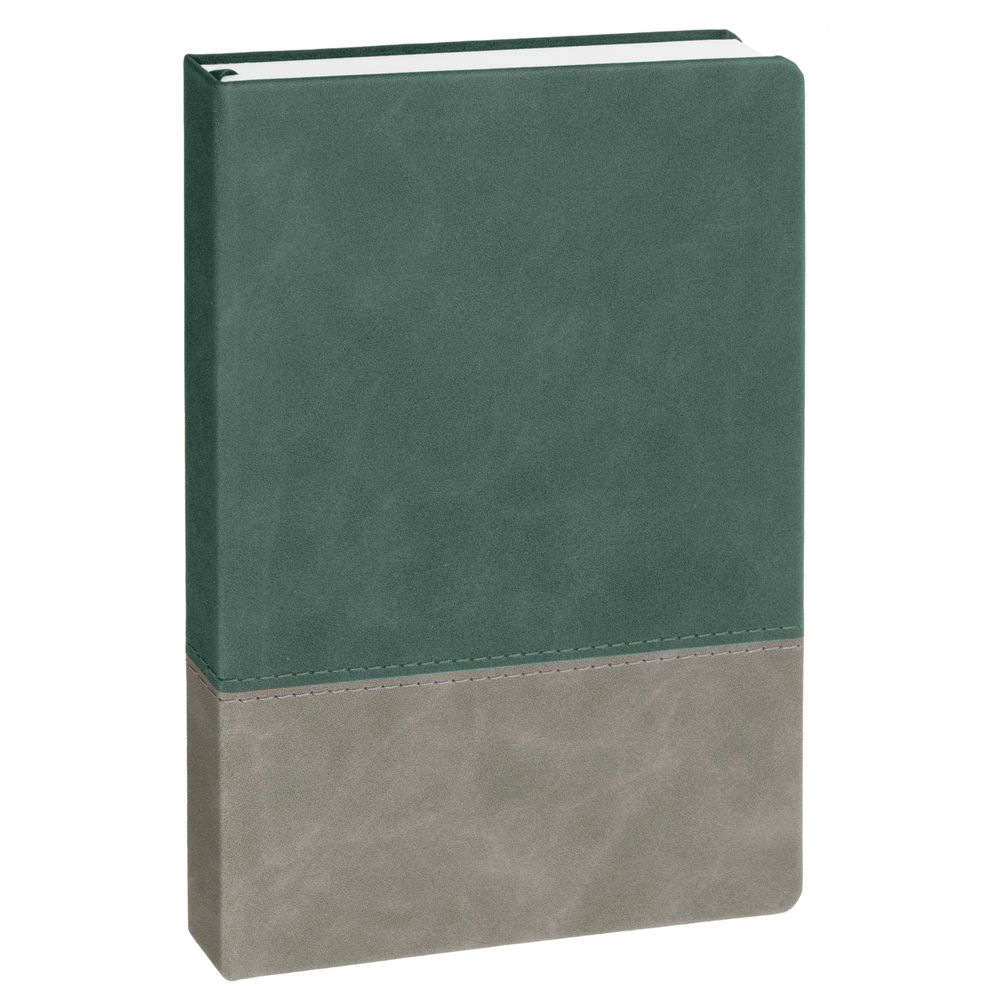 Ежедневник с твердой обложкой, без поролона, со сшивкой материалов Nubuck Touch, серый СС, и Nubuck Touch зеленый FF, дополнен двойным ляссе и петлей-резинкой для ручки.