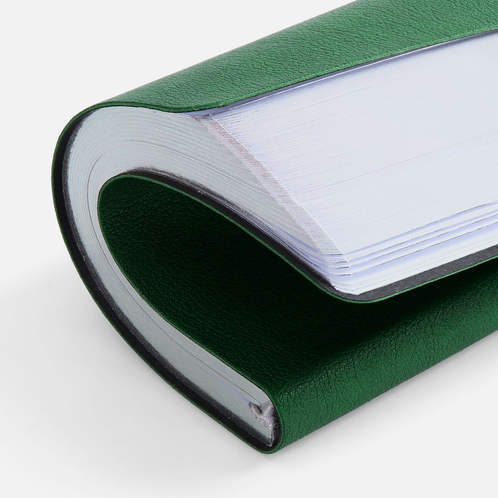 Ежедневник с гибкой обложкой, выполнен из материала Petrus, зеленый FF, дополнен серым ляссе с металлическим шильдиком.