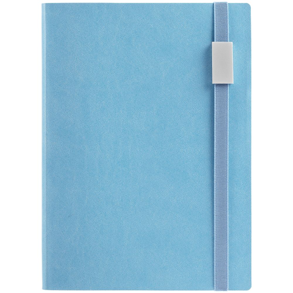 Ежедневник с гибкой обложкой, выполнен из материала Latte, голубой JJ, дополнен резинкой шириной 1 см с металлическим шильдом, капталом и ляссе голубого цвета.