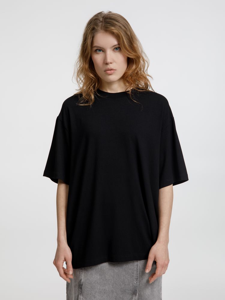 Футболка оверсайз из вискозы с лайкрой.- Круглая горловина выполнена резинкой 1x1