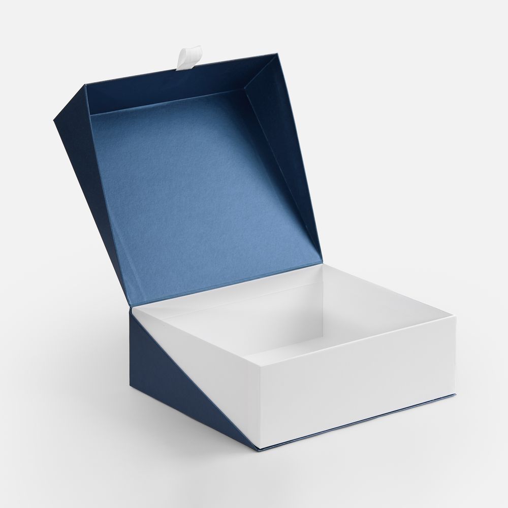 Коробка изготовлена из переплетного картона. Внутренний короб каширован мелованной бумагой с ламинацией, внешний корпус — лайнером из металлизированной бумаги Pearl Dream Blue, плотностью 135 г/м². Крышка фиксируется на магнит. -