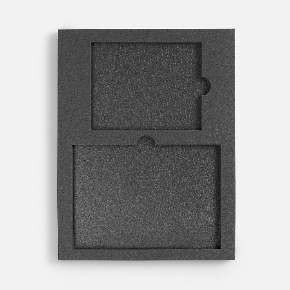 Ложемент, изготовленный из материала Izolon 500 черного цвета, представляет собой многослойную конструкцию, состоящую из нижнего слоя толщиной 5 мм и верхнего слоя толщиной 10 мм. В соответствии с утвержденным макетом, проемы для размещения предметов могут быть спроектированы как в одном, так и в обоих слоях.