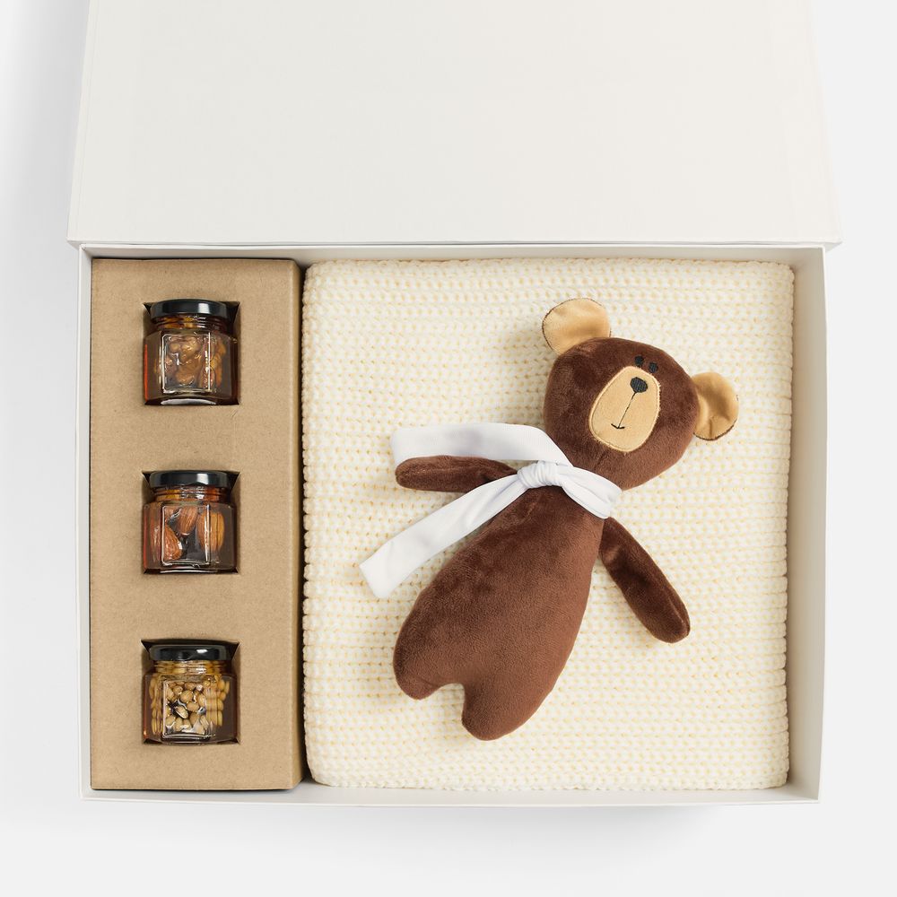 Милый мишка в шарфике с целой коллекцией разнообразного ароматного меда идеально дополняет основной, более практичный подарок — объемный шарф из толстой пряжи, который впишется в любой зимний образ. -