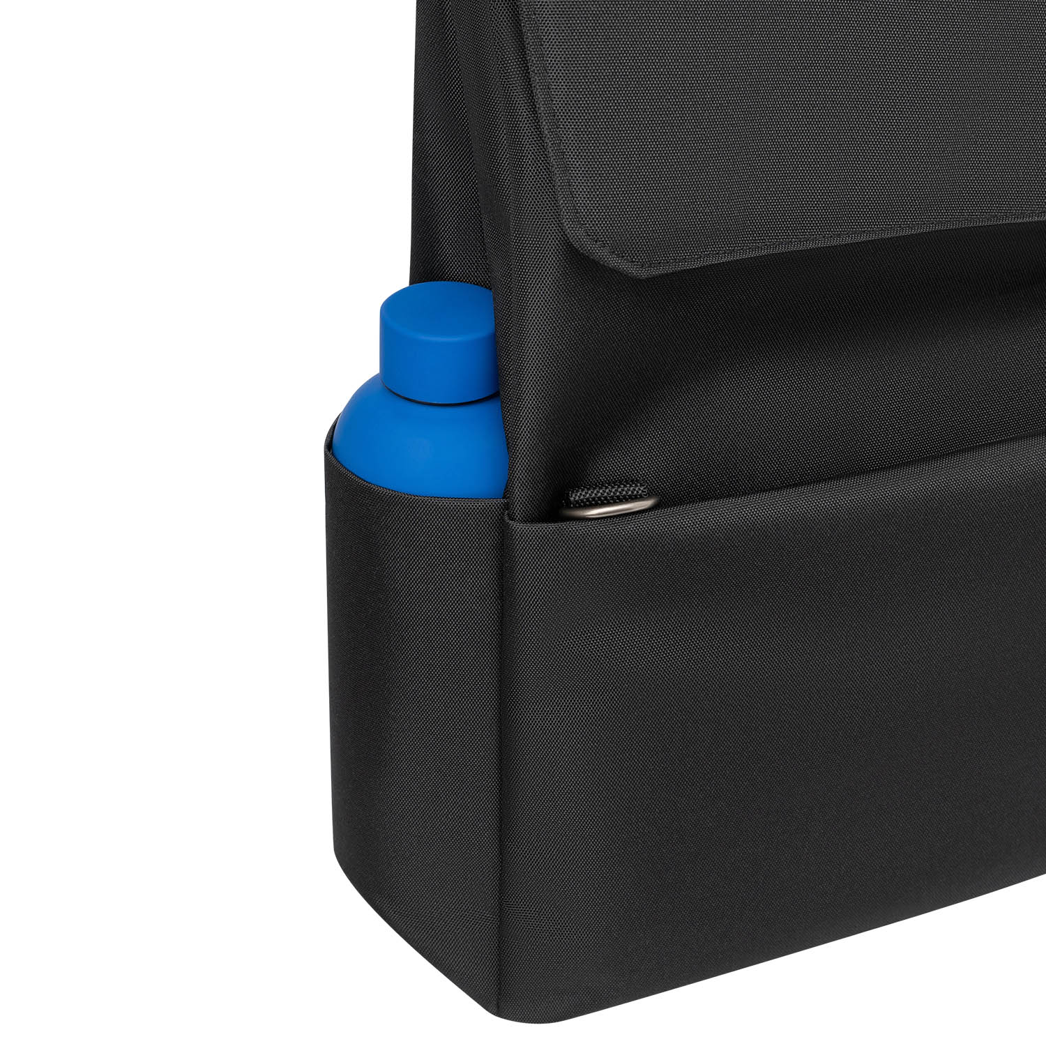Основное отделение вмещает ноутбук до 15,6 дюймов в уплотненном кармане с фиксирующим ремнем на липучке. Внутри основного отделения есть карман для фиксации пластиковой бутылки или небольшого термоса. Боковые карманы разного типа — один объемный на молнии, второй плоский — позволяют удобно разместить все необходимые вещи.