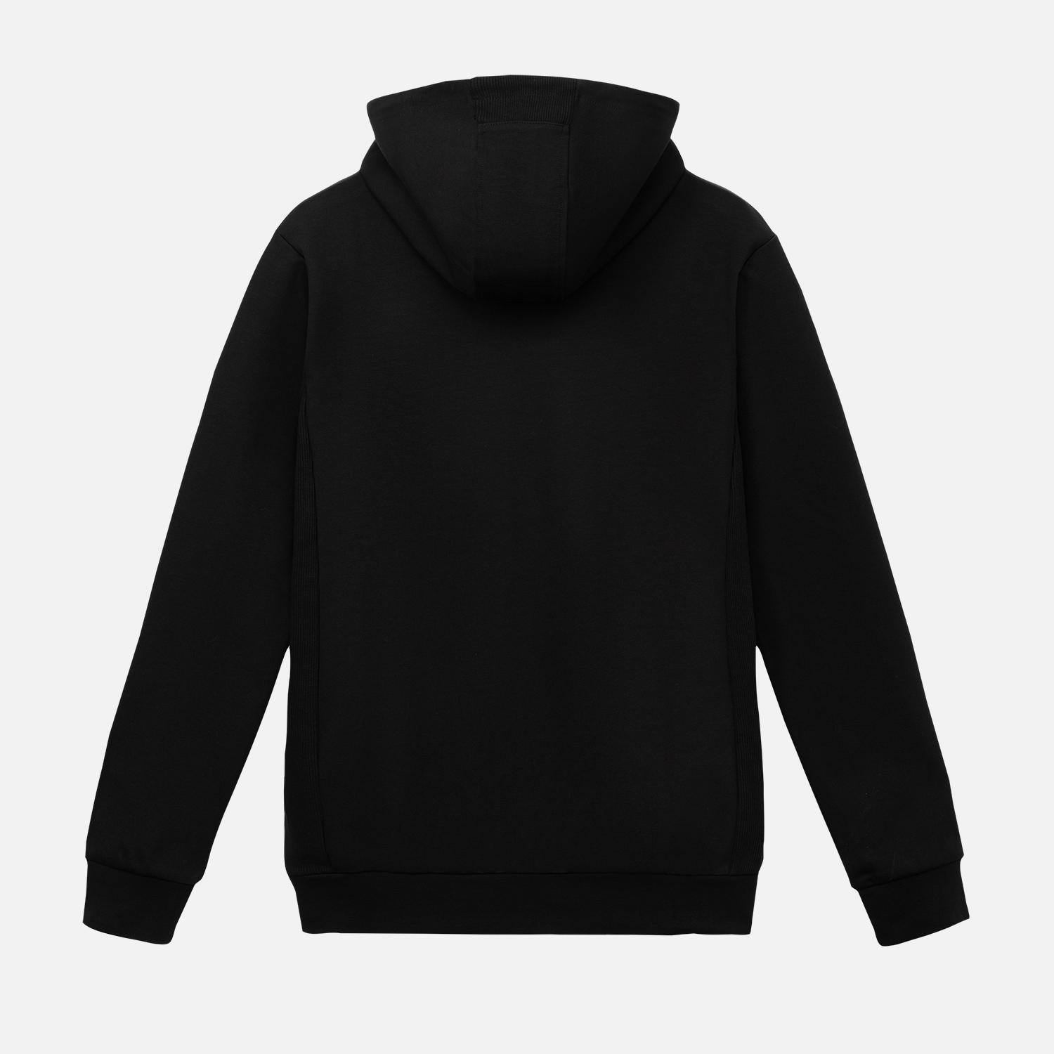 Толстовка сделана из мягкой и прочной ткани интерлок "doubleface", которая приятна к телу и легка в уходе, не растягивается, не выцветает и не деформируется после стирки. Манжеты и низ сделаны из плотной резинки 2х2, благодаря чему вещь держит форму. Карманы на потайных молниях придают толстовке аккуратный вид. Капюшон на подкладке в тон регулируется шнурками.