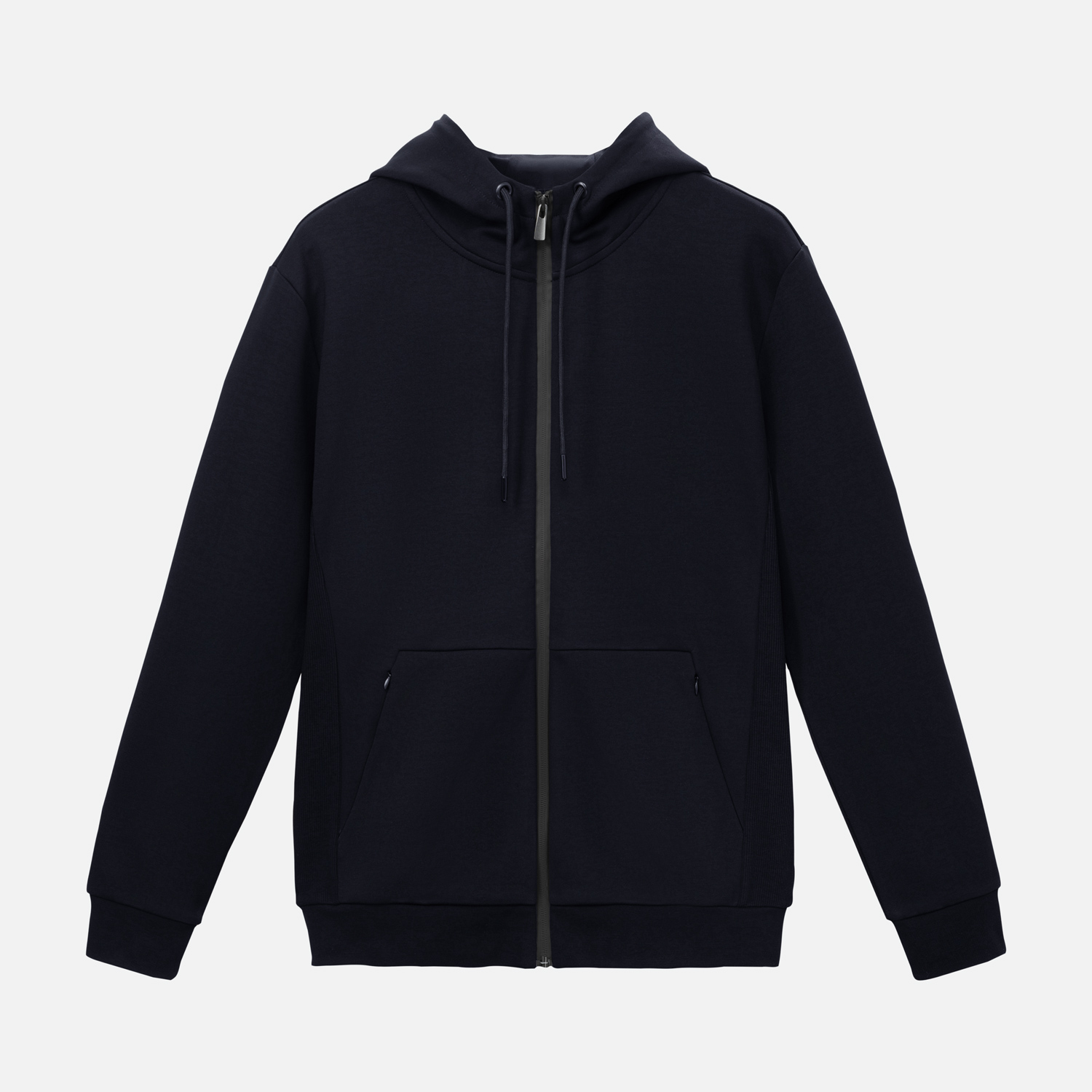 Толстовка сделана из мягкой и прочной ткани интерлок "doubleface", которая приятна к телу и легка в уходе, не растягивается, не выцветает и не деформируется после стирки. Манжеты и низ сделаны из плотной резинки 2х2, благодаря чему вещь держит форму. Карманы на потайных молниях придают толстовке аккуратный вид. Капюшон на подкладке из ткани джерси в тон регулируется шнурками.