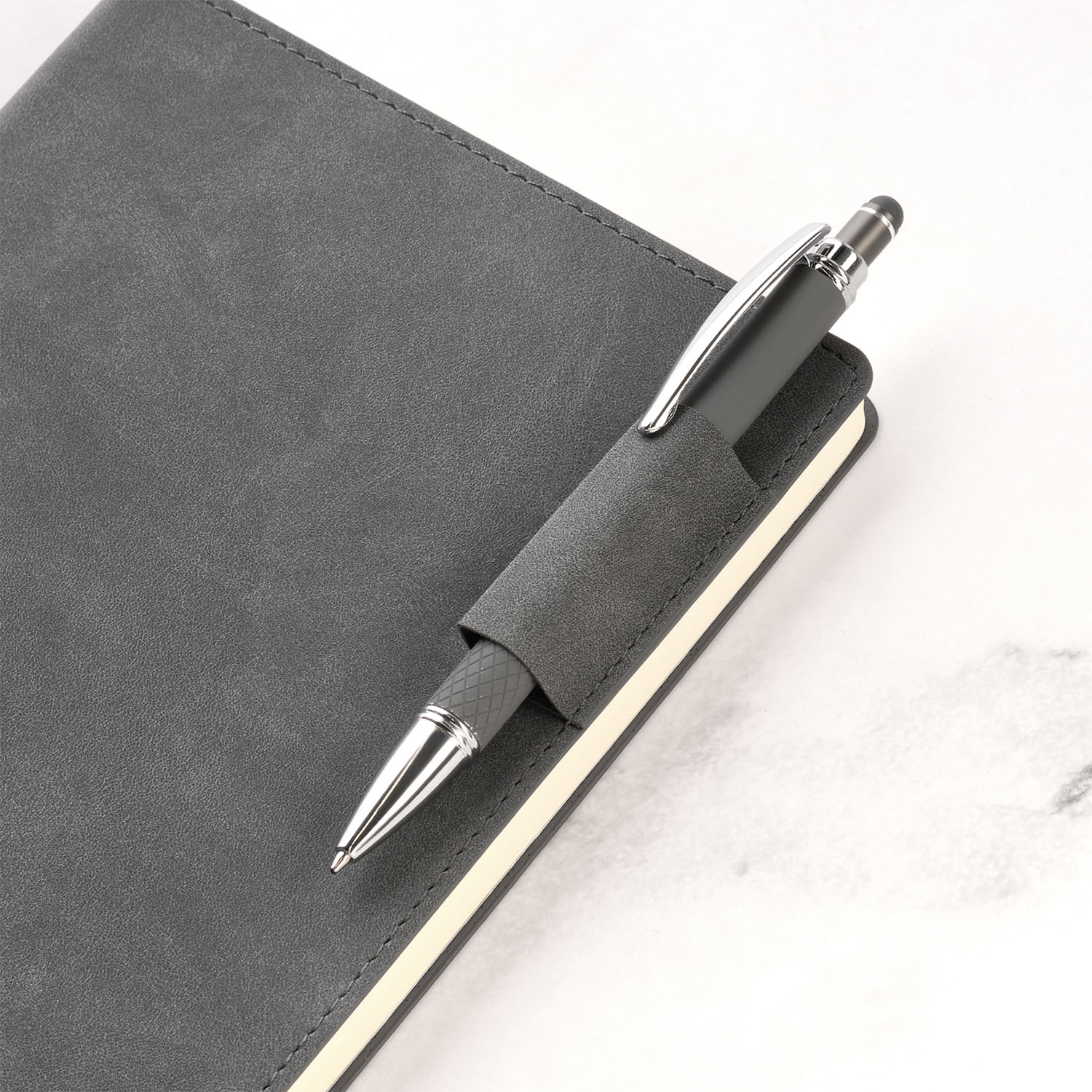 Мягкий на ощупь материал с мелкими вкраплениями имитирует натуральную замшу, а петелька для ручки добавляет практичности. Сдержанные оттенки обложки, форзаца и нахзаца гармонично сочетаются между собой.