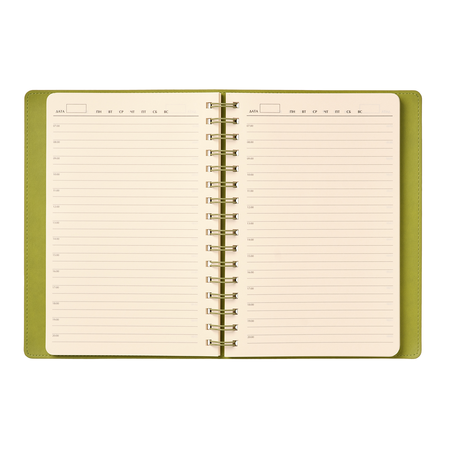 Внутренний блок с кремовыми страницами и срезом гармонично сочетается с нежным оттенком форзаца и нахзаца, повторяющим цвет внутреннего материала обложки. Надежная полускрытая пружина обеспечивает удобство использования и долговечность.