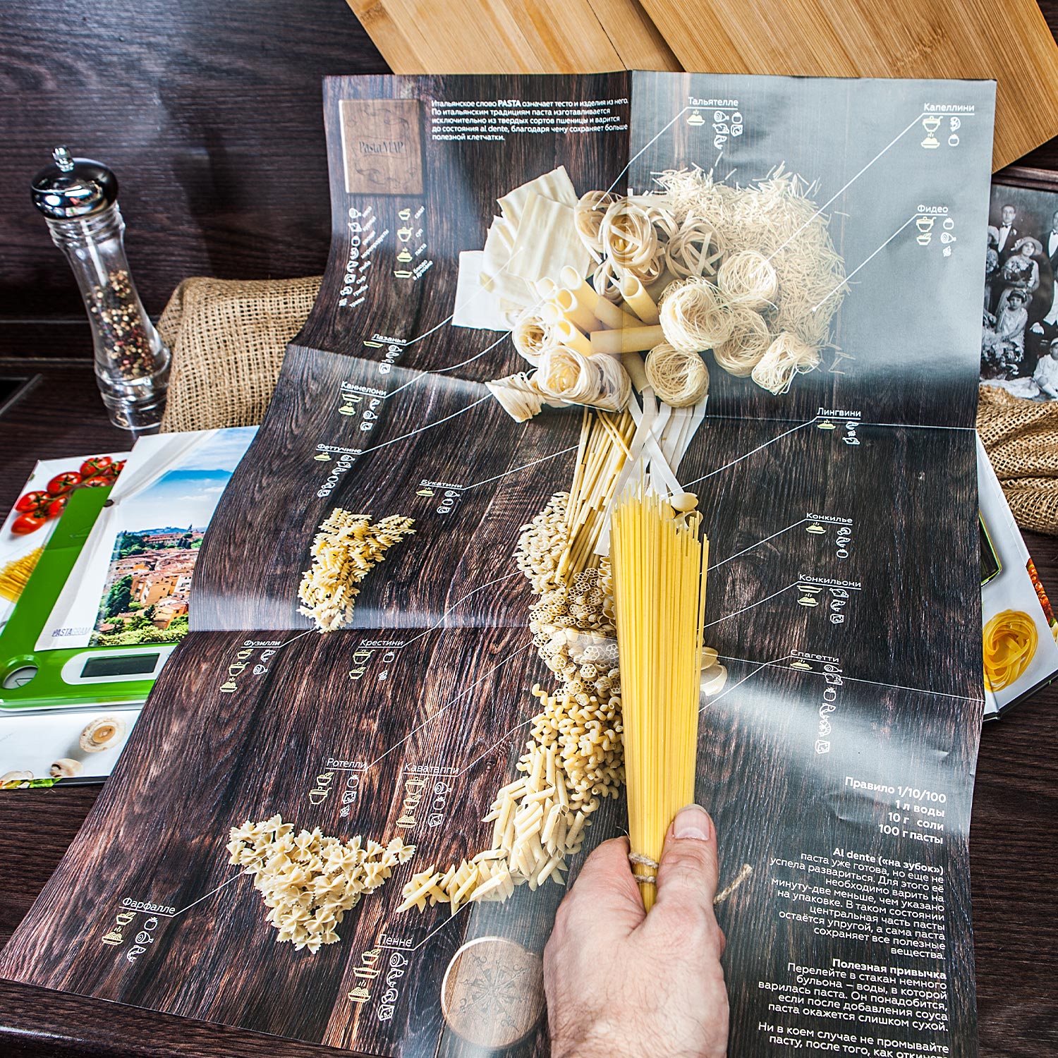 Концептуальный подарочный набор, посвящённый Италии. Стильный и креативный подарок позволит прожить один день, как настоящий итальянец — следуя за рассказчиком, совершить путешествие по стране, попутно готовя несколько видов вкуснейшей пасты по традиционным рецептам.