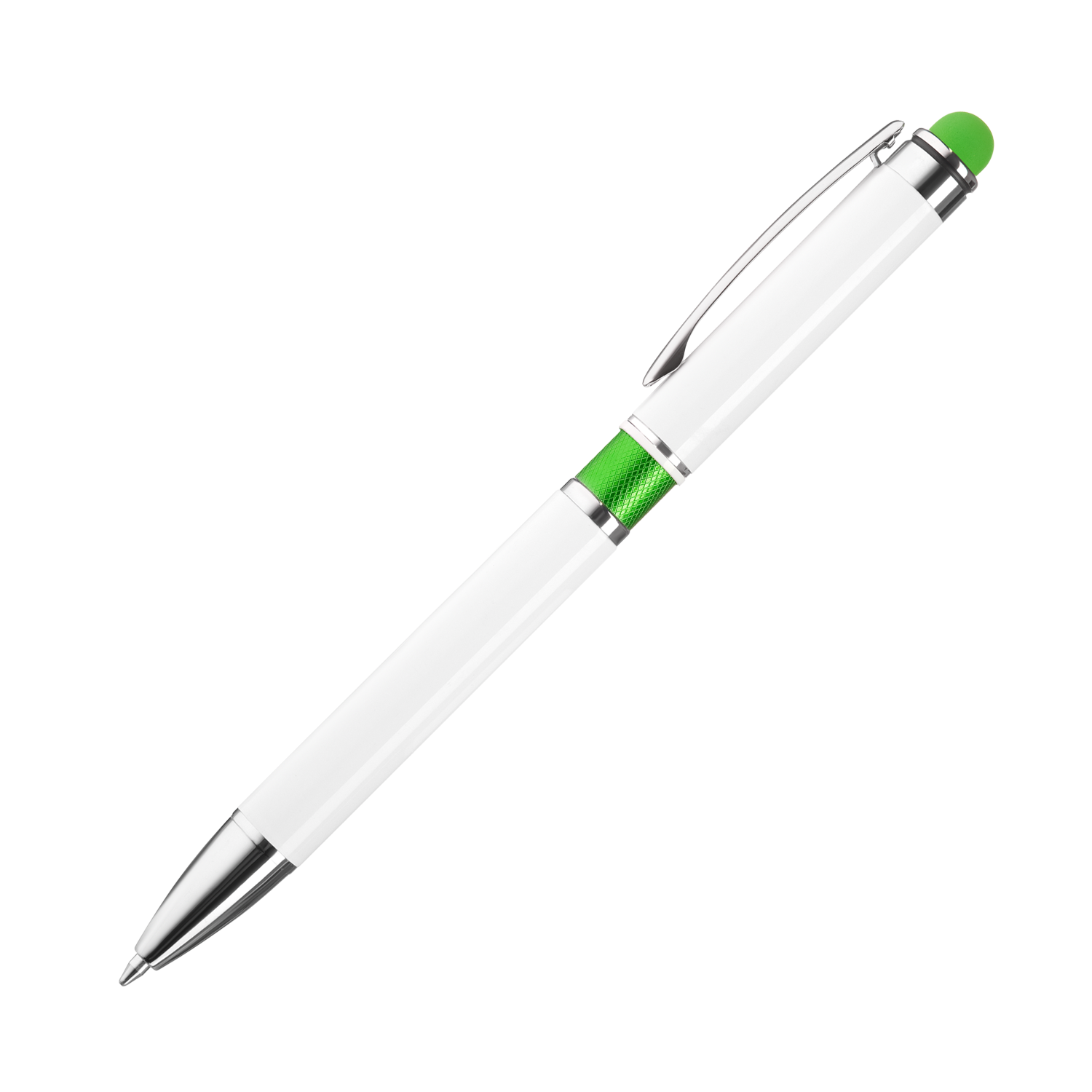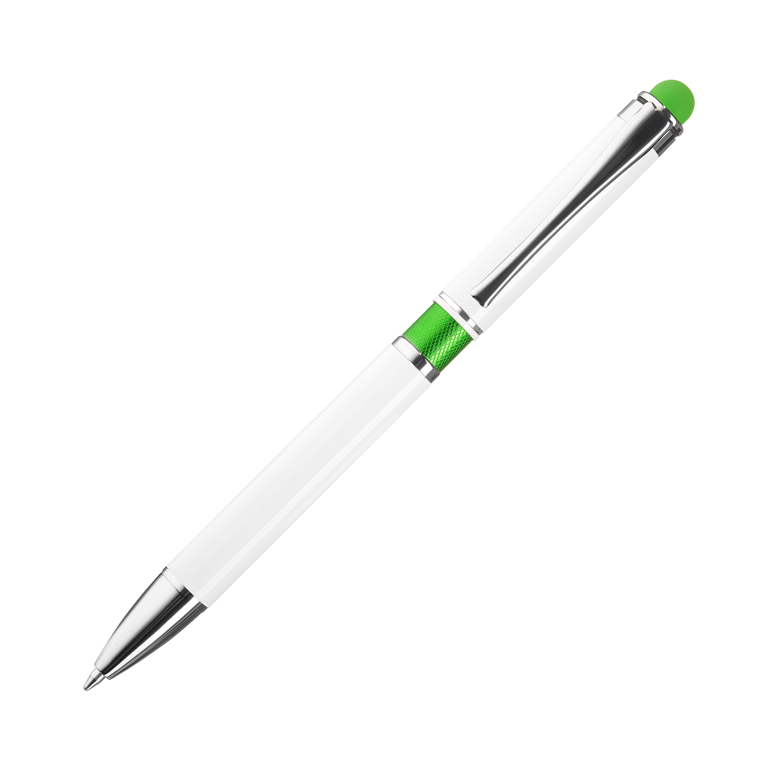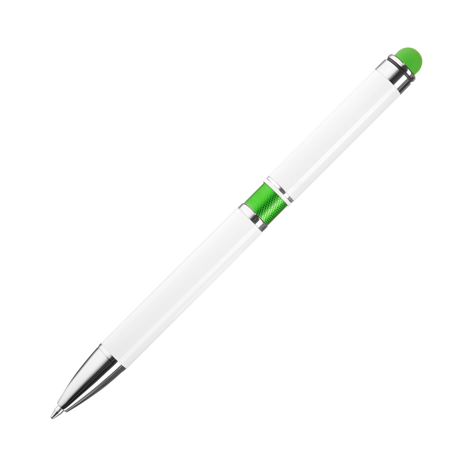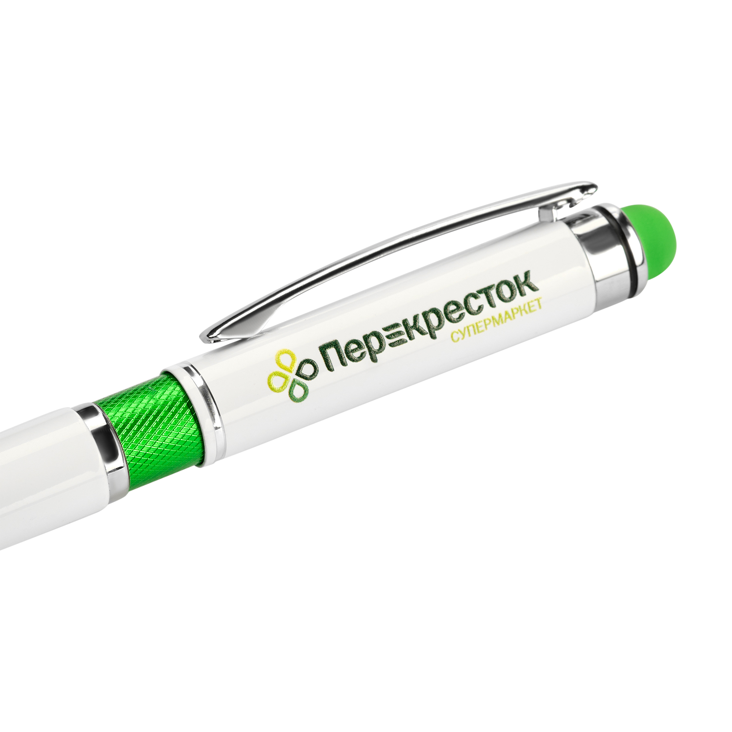 Алюминиевая ручка с белым корпусом, цветной вставкой и стилусом в цвет вставки.