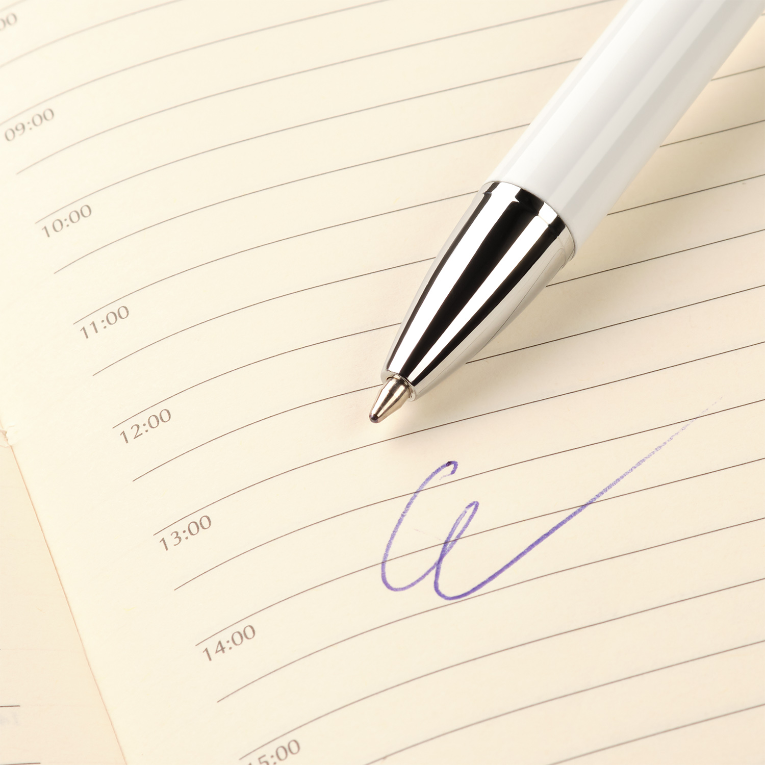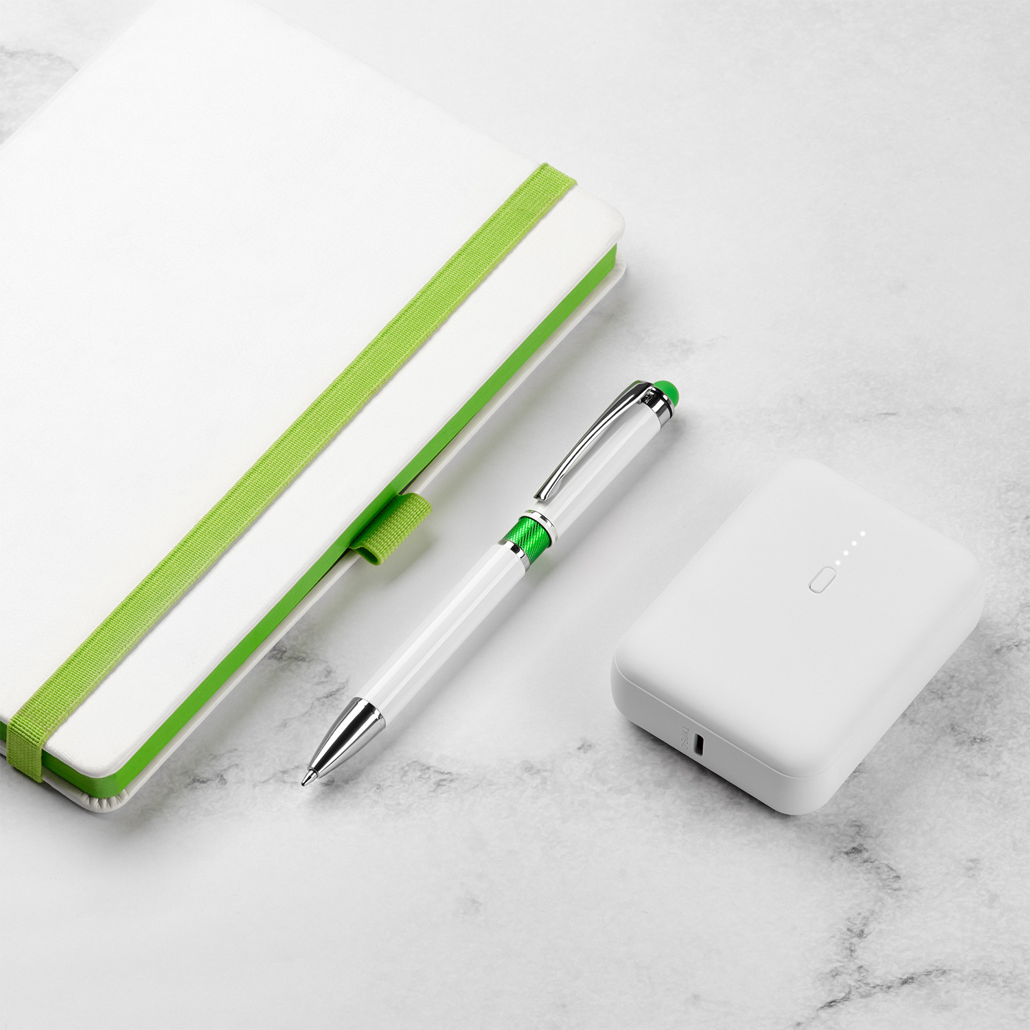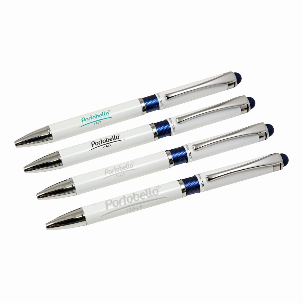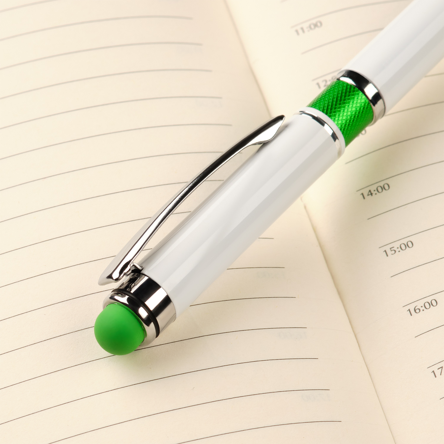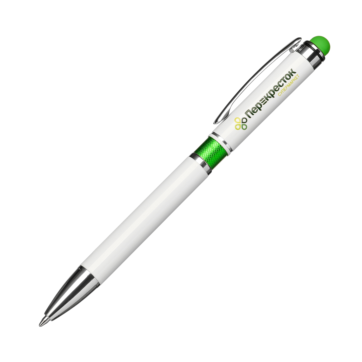 Алюминиевая ручка с белым корпусом, цветной вставкой и стилусом в цвет вставки.