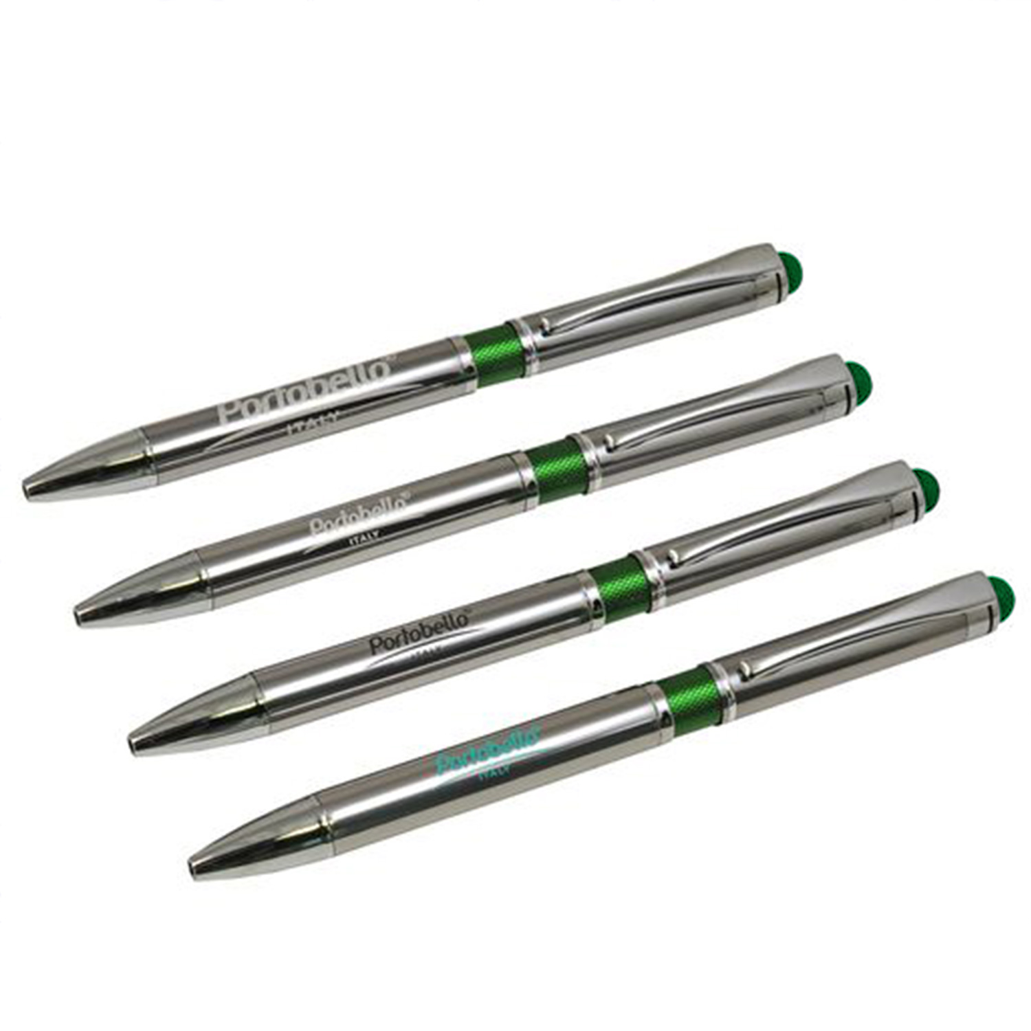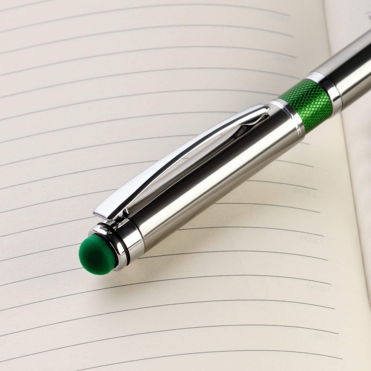 Классическая ручка цвета металлик с цветными деталями. Оснащена стилусом для работы с сенсорными экранами.