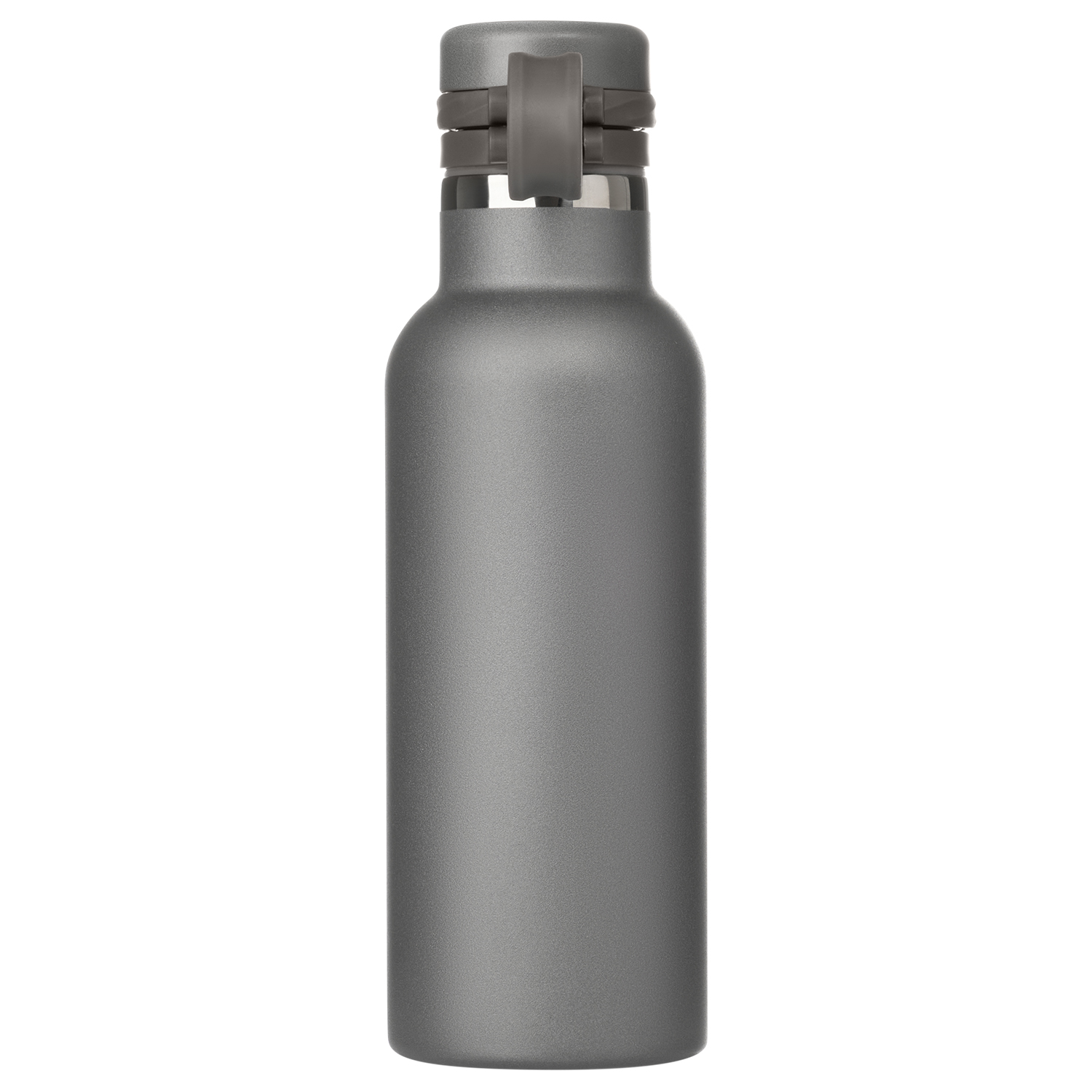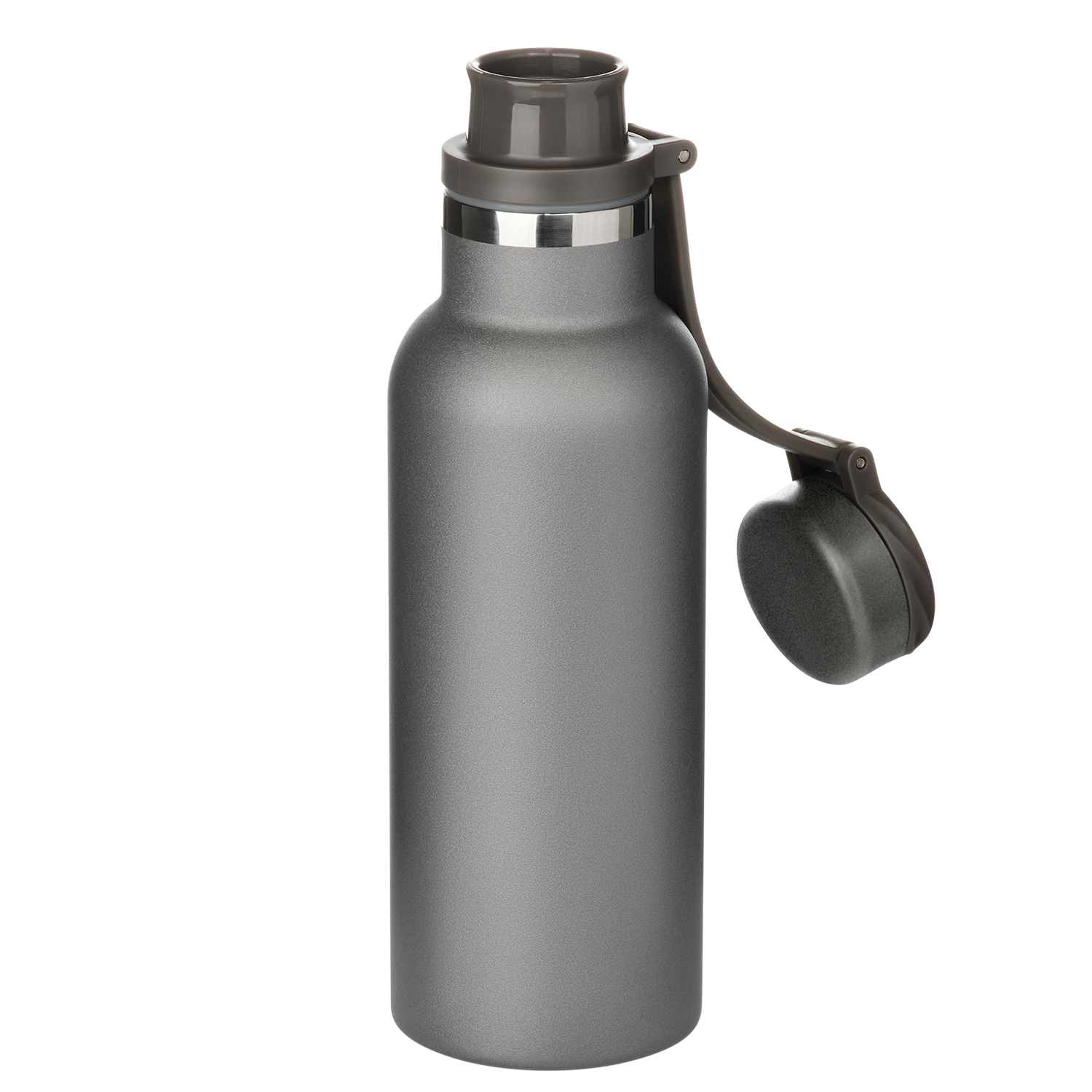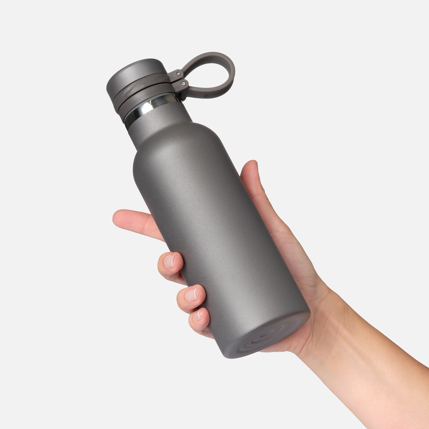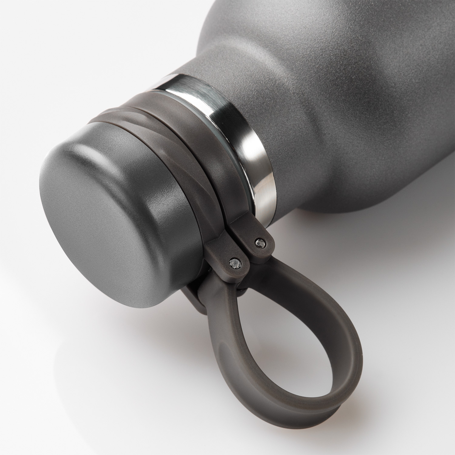 Вакуумная герметичная конструкция выполнена из двухслойной высоколегированной стали 304 марки, что делает конструкцию более прочной и устойчивой к мелким сколам и царапинам. Крышка из высококачественного пластика, оснащена удобной силиконовой петелькой для переноски. Бутылку можно переворачивать и класть в сумку.
