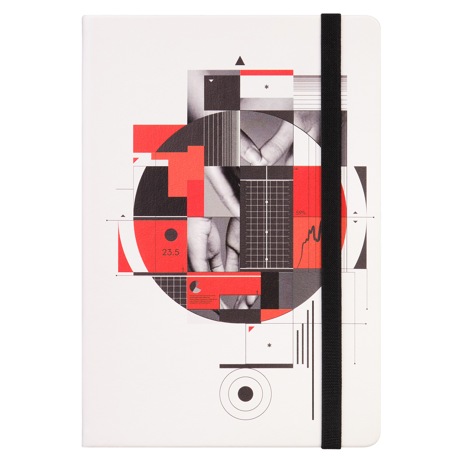 Недатированный ежедневник выполнен в жесткой обложке из искусственной кожи со скругленными уголками. Переплетный материал гладкий, с легкой естественной паутинкой морщин, имеет полуглянцевый блеск. Цвет – чистый белый. Черные матовые форзац и нахзац, а также черный срез блока создают оригинальный динамичный цветовой ансамбль и подчеркивают белизну обложки. Страницы светло-кремового цвета, из гладкого офсета, слегка шелковистые, со скругленными уголками. Добавляют изделию мягкую комфортную теплоту. Двойное атласное ляссе составлено из черной и белой лент. Каждая шириной 6 мм, имеет легкий блеск. Вертикальная фиксирующая резинка прочная, надежная и удобная, в тон срезу. Есть петелька для ручки в тон резинки. Карман на заднем форзаце.