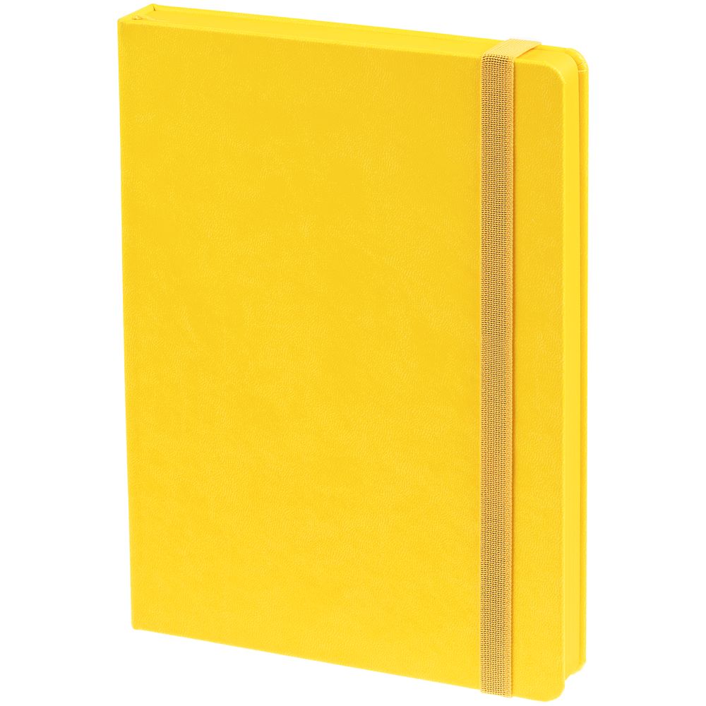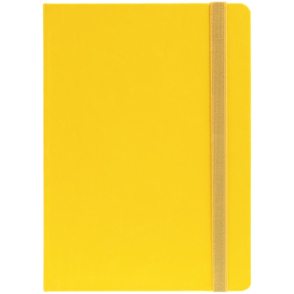 Ежедневник с твердой обложкой, выполнен из материала Latte, желтый КК, обрез зеленого цвета, дополнен резинкой и ляссе желтого цвета.
