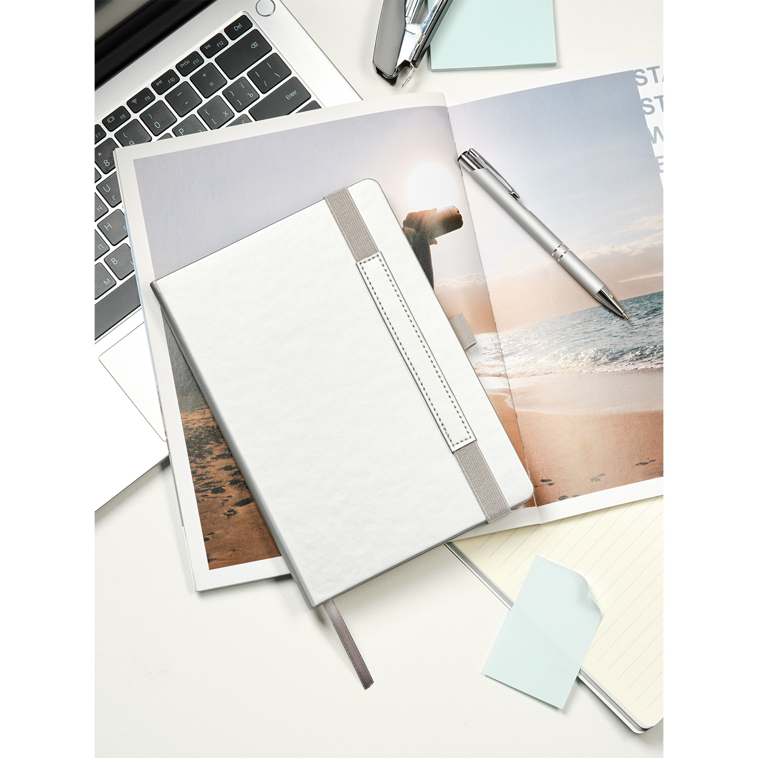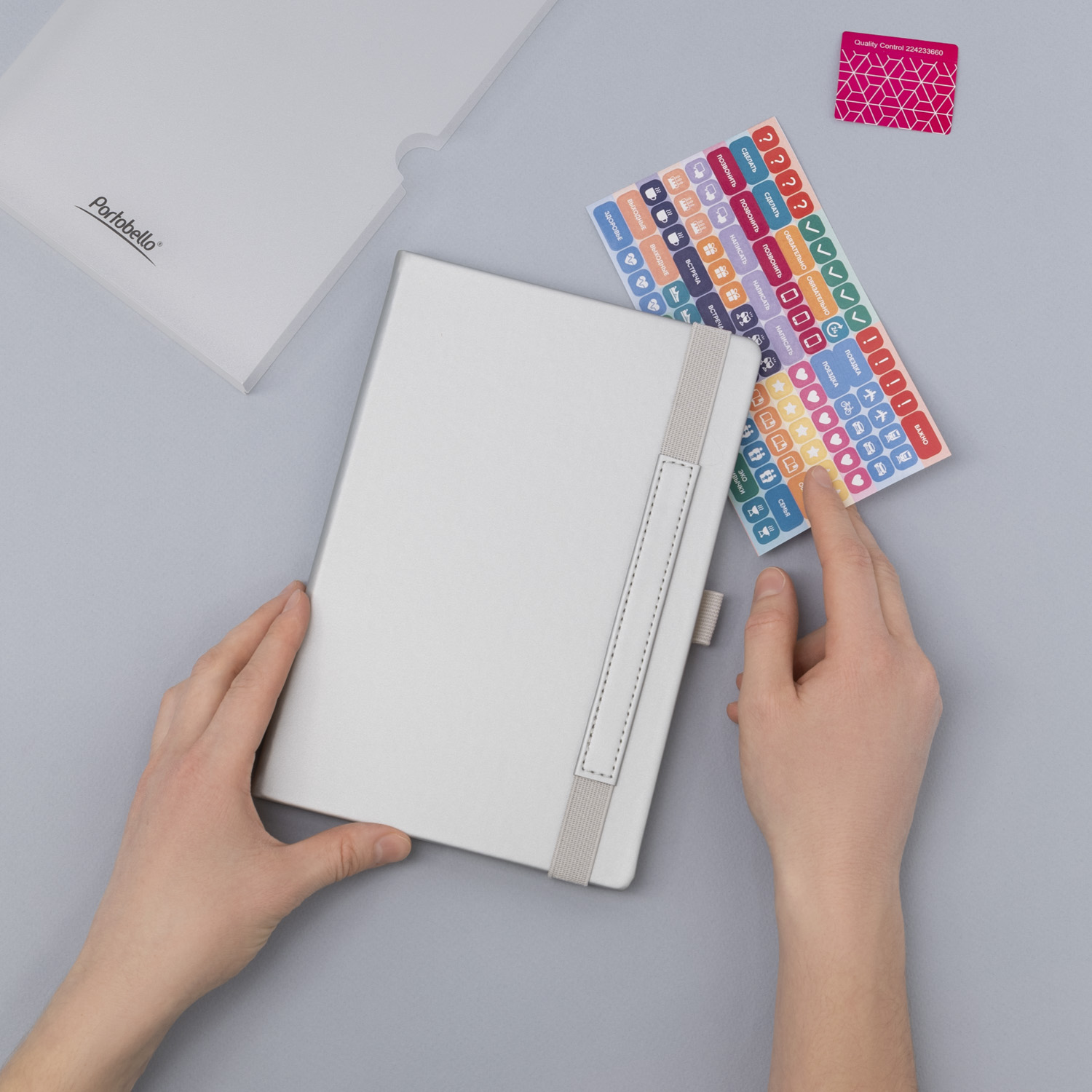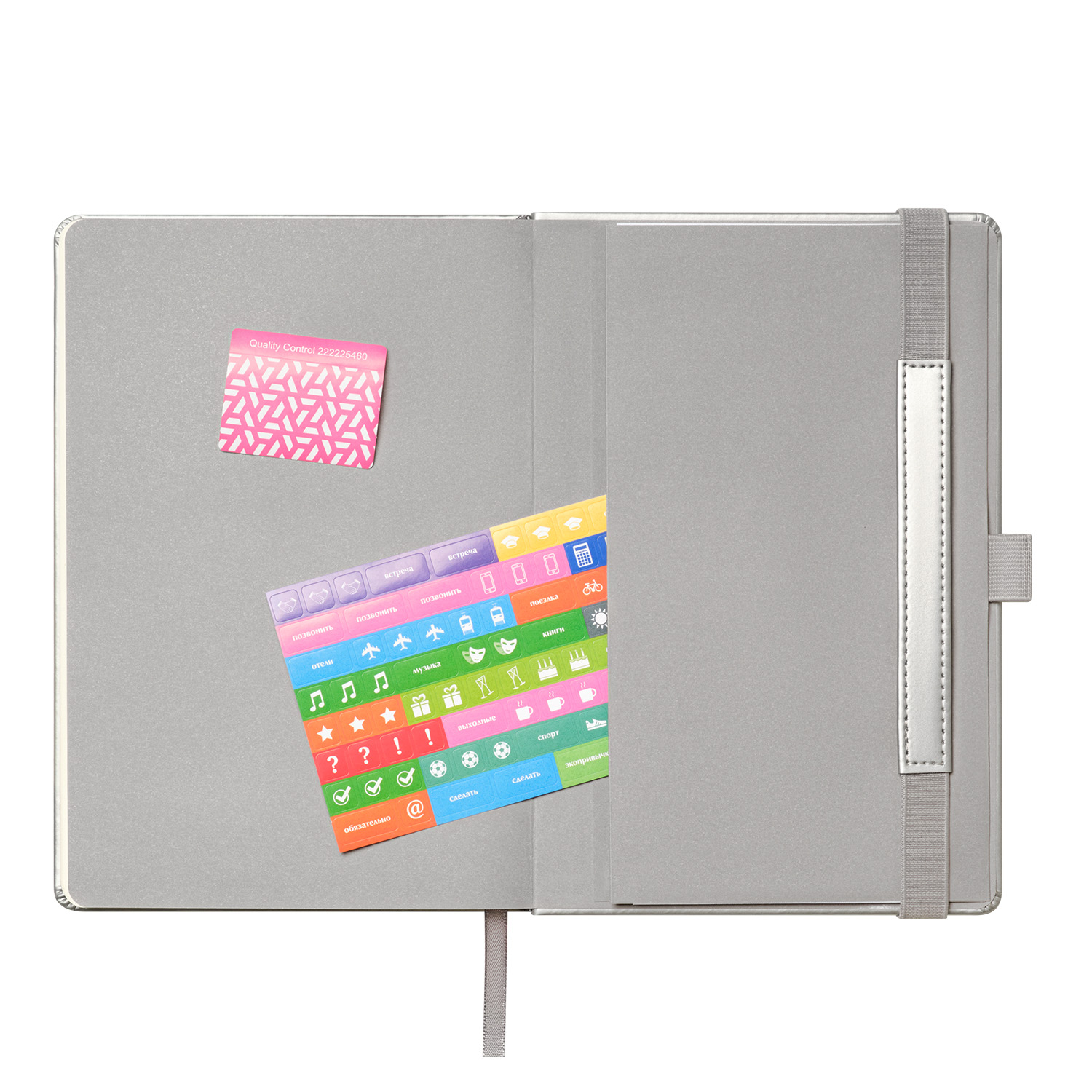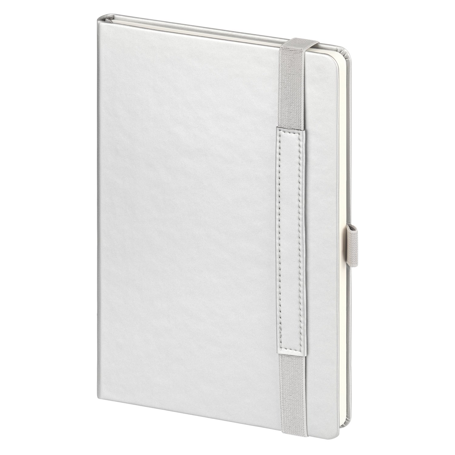 Вертикальная резинка-фиксатор с вставкой из ПУ-материала обложки и петелька под ручку, в цвет обложки