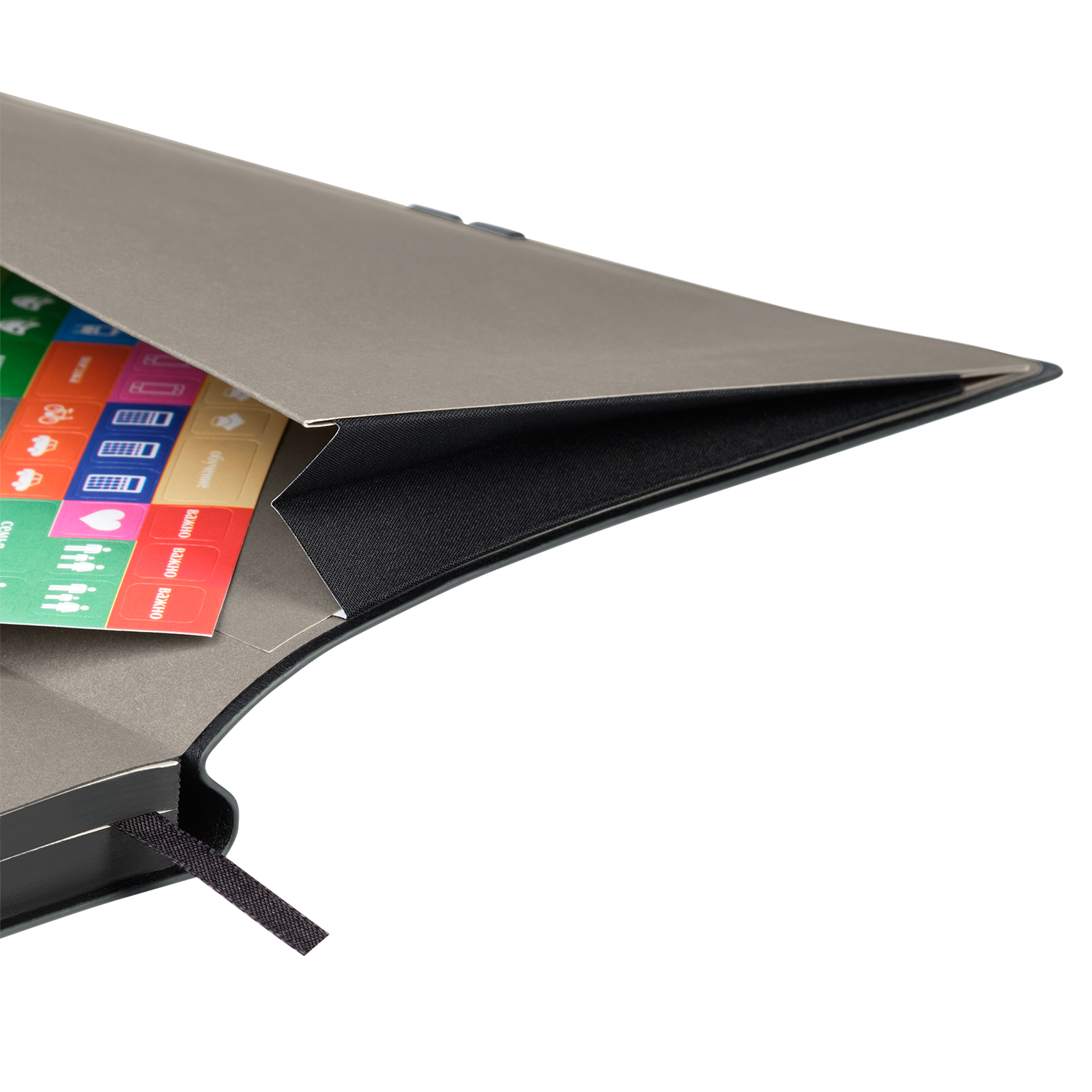 Горизонтальная резинка, фиксирующая обложку, дополнена металлическими элементами, которые не только защищают обложку от повреждений, но и служат стильным акцентом. Матовый срез в тон обложки и светло-кремовые страницы из гладкого, слегка шелковистого офсета подчеркивают изысканность дизайна. Атласное ляссе гармонично завершает образ этого элегантного ежедневника.