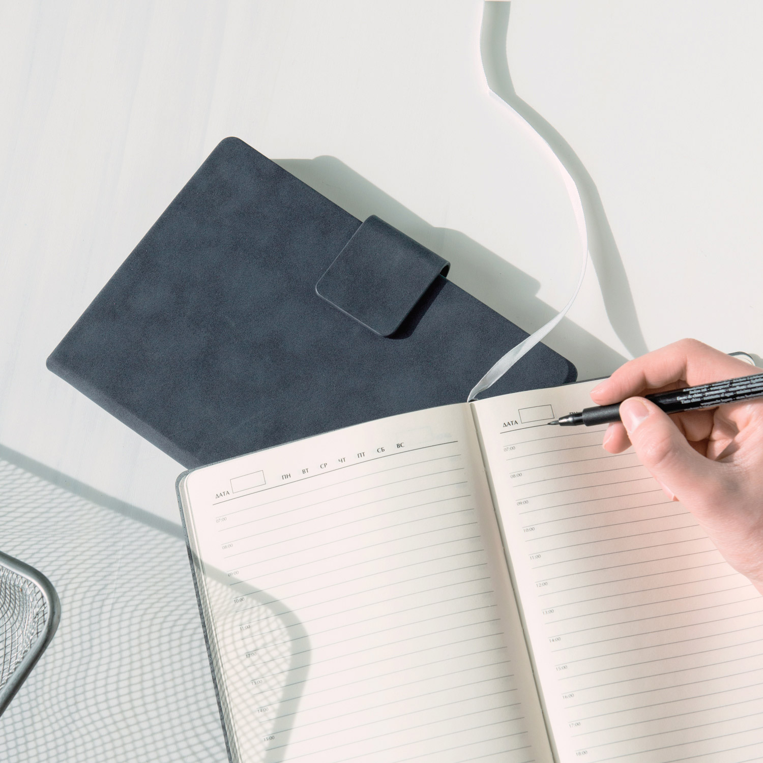 Недатированный ежедневник Ritz сочетает в себе элегантность и функциональность. Твердая обложка из высококачественной искусственной кожи с бархатистой текстурой, напоминающей нубук, приятна на ощупь.
