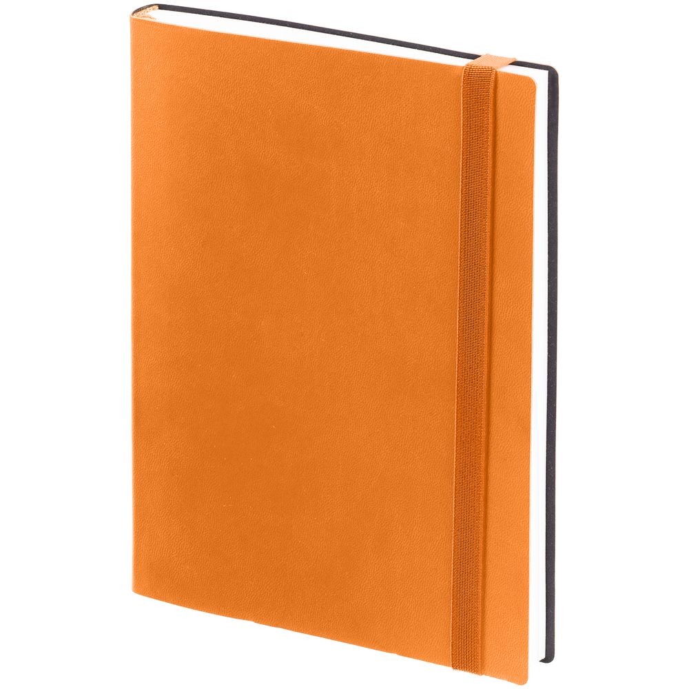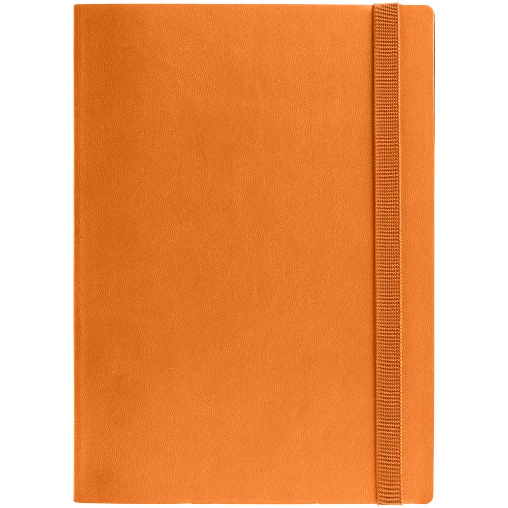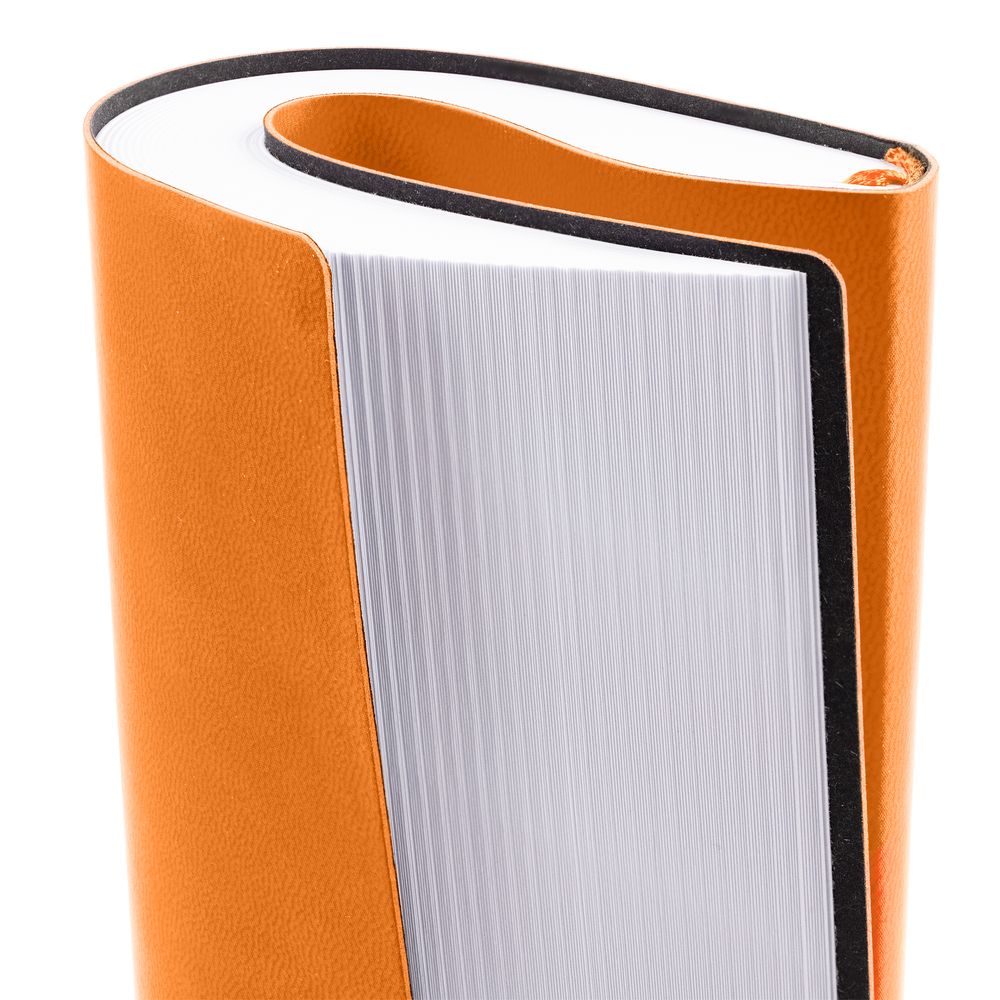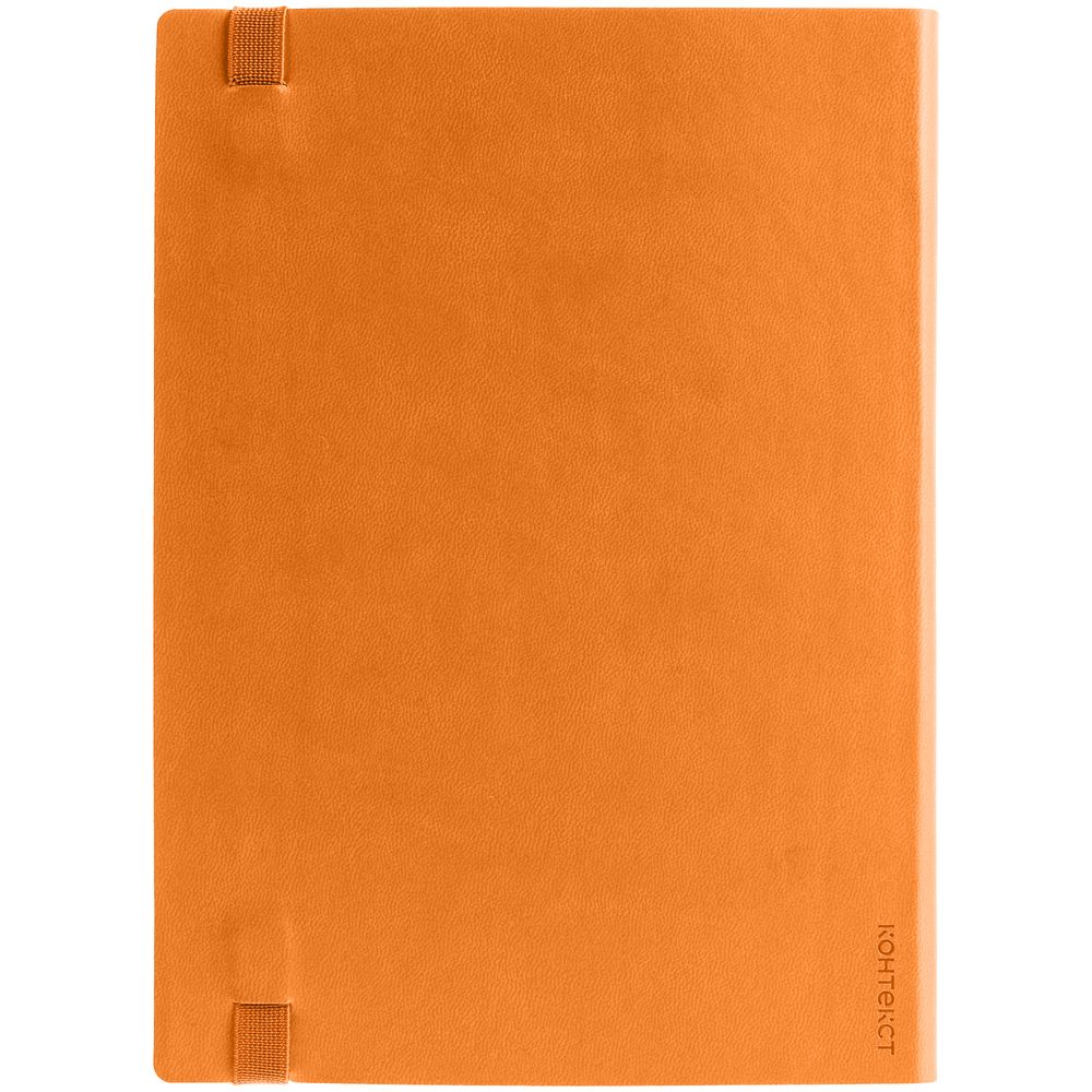 Ежедневник с гибкой обложкой выполнен из материала Latte, оранжевый ОО, и дополнен резинкой шириной 1 см, капталом и ляссе оранжевого цвета.