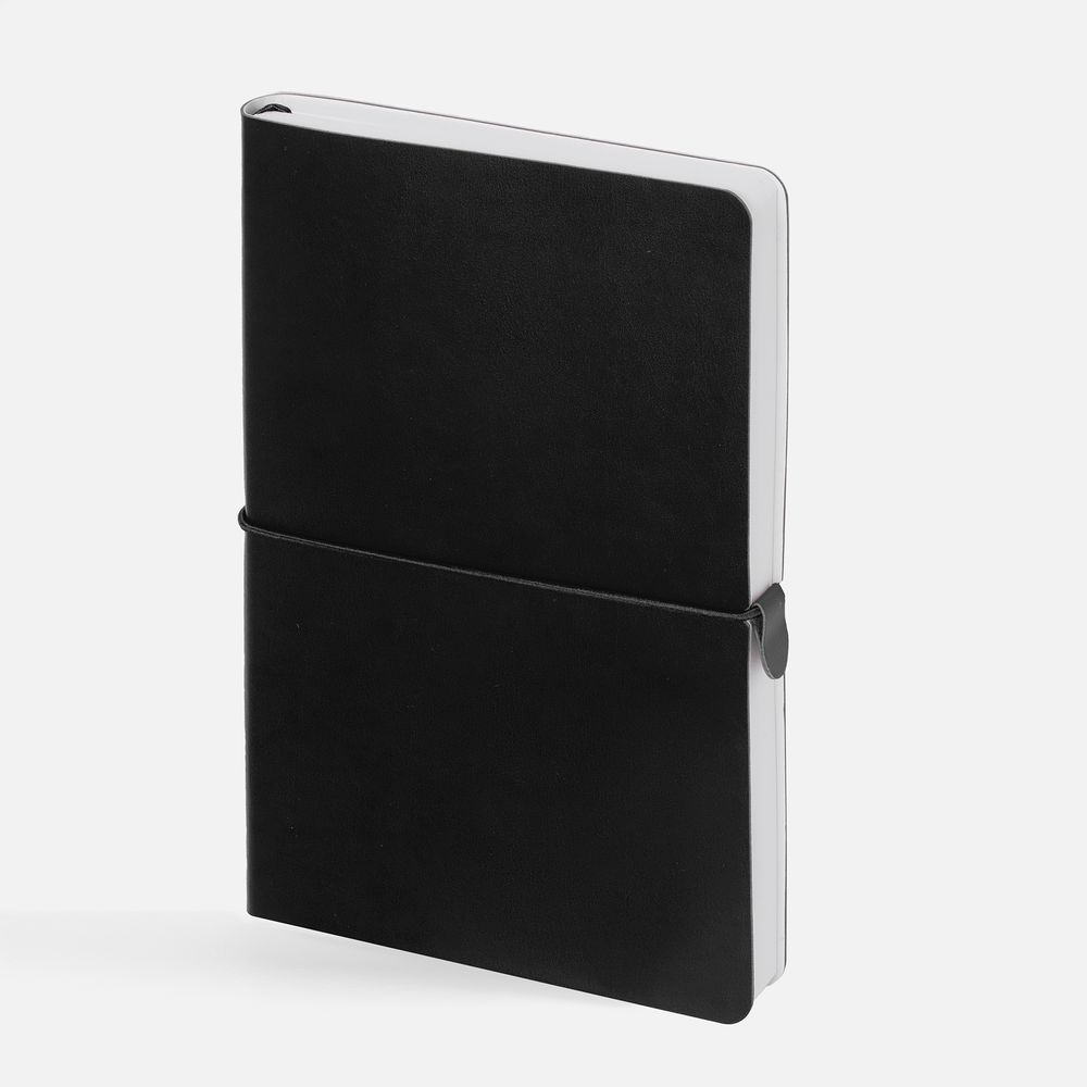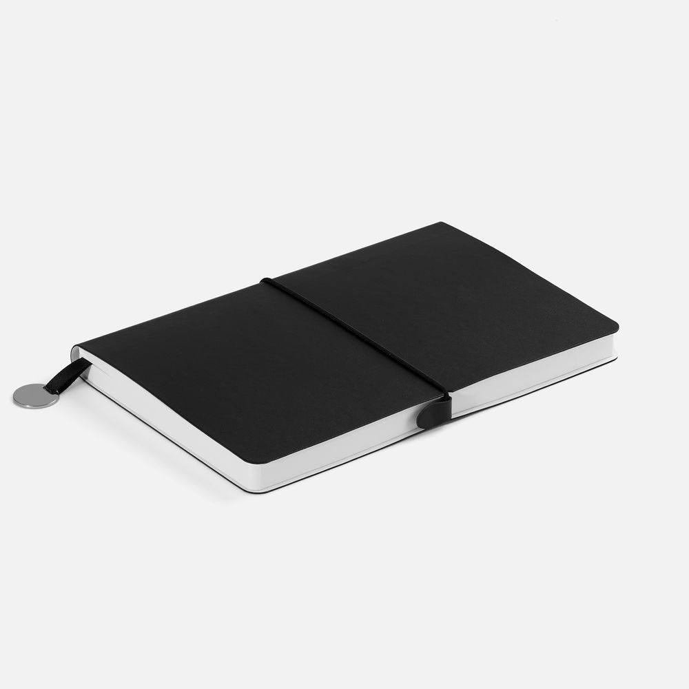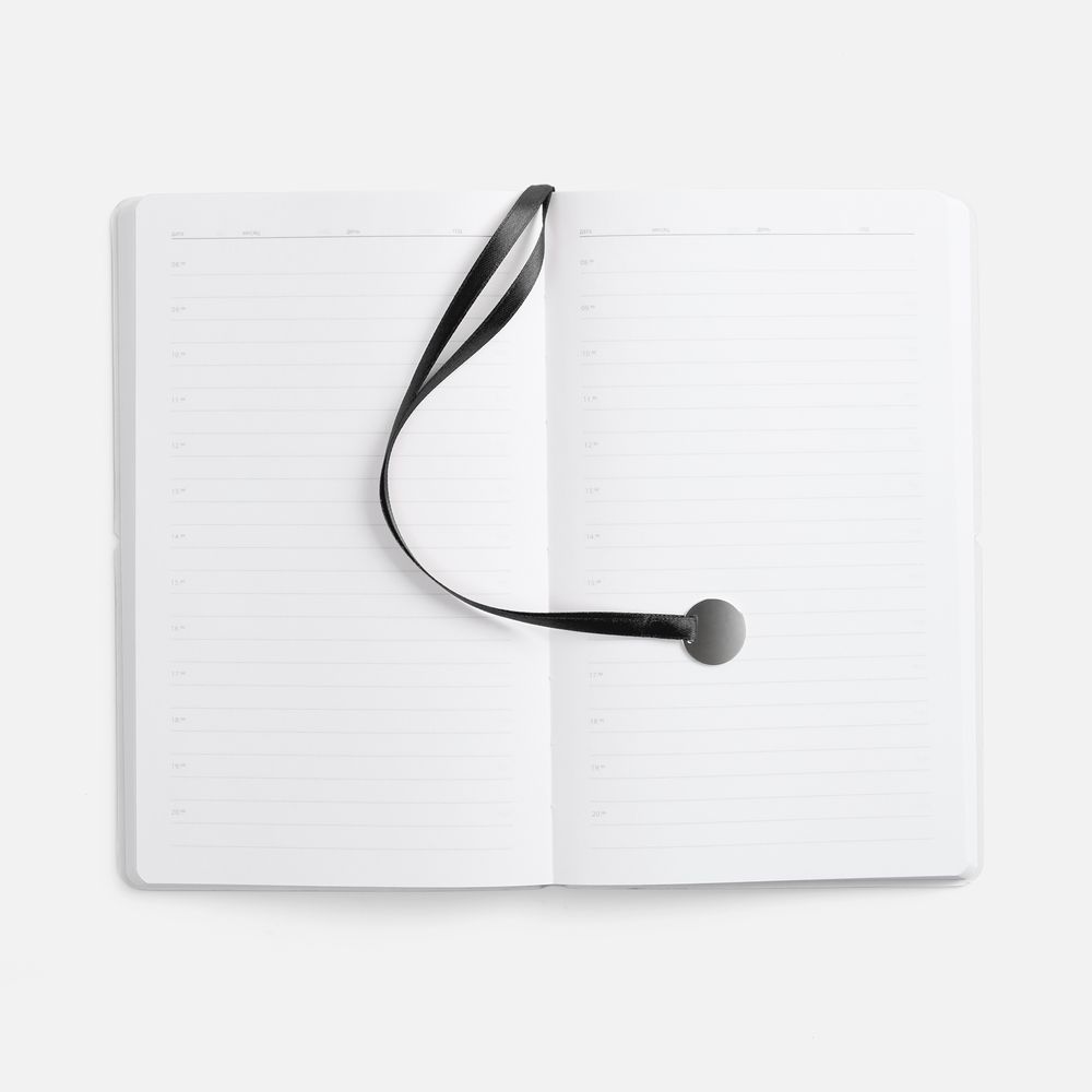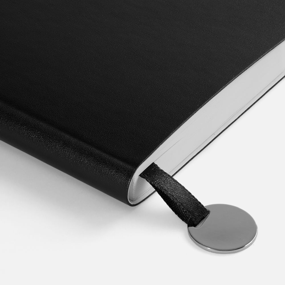 Ежедневник с гибкой обложкой, выполнен из материала Waltz, черный АА, дополнен ляссе в цвет обложки с металлическим шильдом.